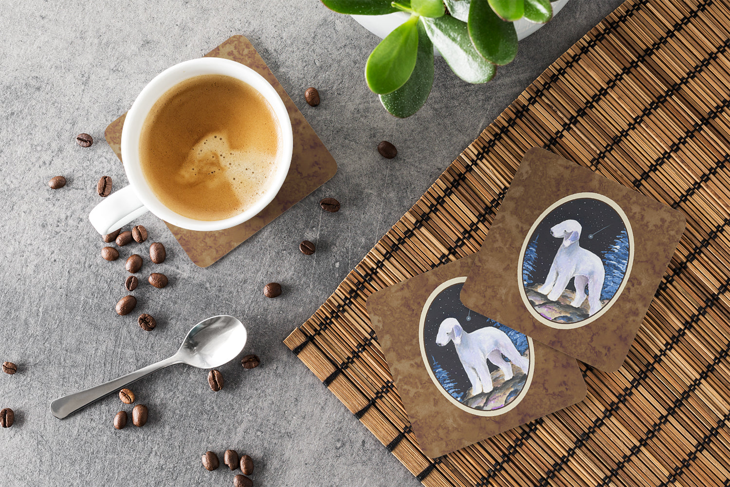 Decorate your space with our Bedlington Terrier artwork on a Coaster set. Presenting our Set of 4 Foam Coasters, a stylish and practical addition to your table setting. Each square coaster, measuring 3 1/2 inches by 3 1/2 inches, is perfectly sized to accommodate various drinkware, from coffee mugs to tumblers. These coasters stand out with their full-color artwork, permanently dyed onto the material for a vibrant and fade-resistant finish. They're not just functional, they're a fashionable statement, adding a touch of flair to any gathering or event. Our foam coasters serve a dual purpose - they protect your table from water stains and are perfect for both hot and cold drinks. The material used is similar to that of our high-quality mouse pads, ensuring durability and heat resistance. These coasters are easy to maintain - simply wash them in the top of your dishwasher and lay flat to dry. The design won't come off, ensuring they retain their vivid colors for years. Pair them with one of our insulated coolers or huggers for a cohesive, thoughtful gift set. Enhance your beverage experience with our Set of 4 Foam Coasters.