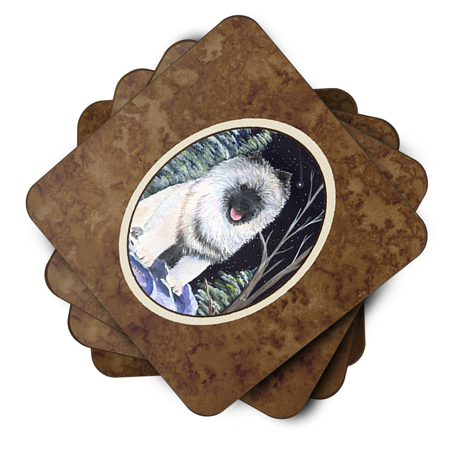 Decorate your space with our Keeshond artwork on a Coaster set. Presenting our Set of 4 Foam Coasters, a stylish and practical addition to your table setting. Each square coaster, measuring 3 1/2 inches by 3 1/2 inches, is perfectly sized to accommodate various drinkware, from coffee mugs to tumblers. These coasters stand out with their full-color artwork, permanently dyed onto the material for a vibrant and fade-resistant finish. They're not just functional, they're a fashionable statement, adding a touch of flair to any gathering or event. Our foam coasters serve a dual purpose - they protect your table from water stains and are perfect for both hot and cold drinks. The material used is similar to that of our high-quality mouse pads, ensuring durability and heat resistance. These coasters are easy to maintain - simply wash them in the top of your dishwasher and lay flat to dry. The design won't come off, ensuring they retain their vivid colors for years. Pair them with one of our insulated coolers or huggers for a cohesive, thoughtful gift set. Enhance your beverage experience with our Set of 4 Foam Coasters.