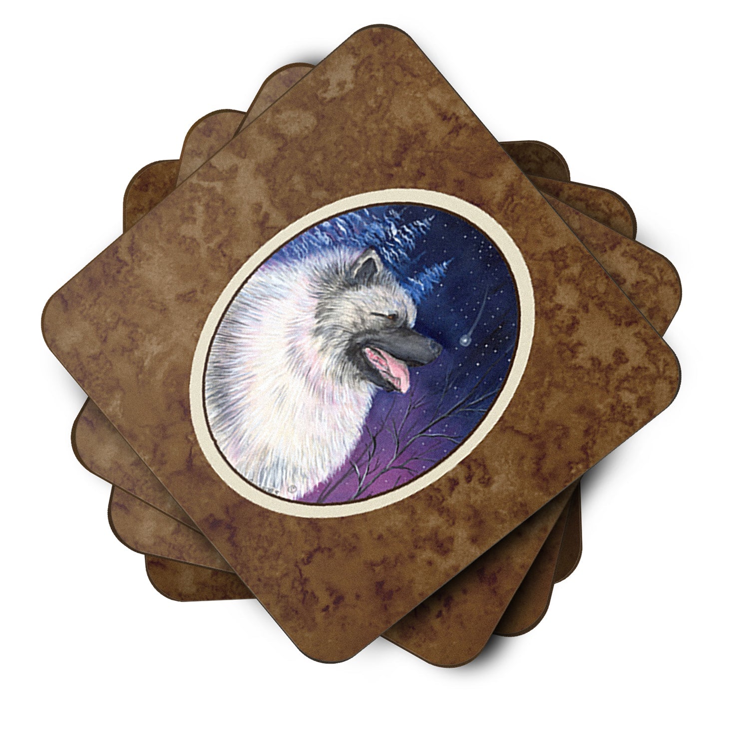 Decorate your space with our Keeshond artwork on a Coaster set. Presenting our Set of 4 Foam Coasters, a stylish and practical addition to your table setting. Each square coaster, measuring 3 1/2 inches by 3 1/2 inches, is perfectly sized to accommodate various drinkware, from coffee mugs to tumblers. These coasters stand out with their full-color artwork, permanently dyed onto the material for a vibrant and fade-resistant finish. They're not just functional, they're a fashionable statement, adding a touch of flair to any gathering or event. Our foam coasters serve a dual purpose - they protect your table from water stains and are perfect for both hot and cold drinks. The material used is similar to that of our high-quality mouse pads, ensuring durability and heat resistance. These coasters are easy to maintain - simply wash them in the top of your dishwasher and lay flat to dry. The design won't come off, ensuring they retain their vivid colors for years. Pair them with one of our insulated coolers or huggers for a cohesive, thoughtful gift set. Enhance your beverage experience with our Set of 4 Foam Coasters.