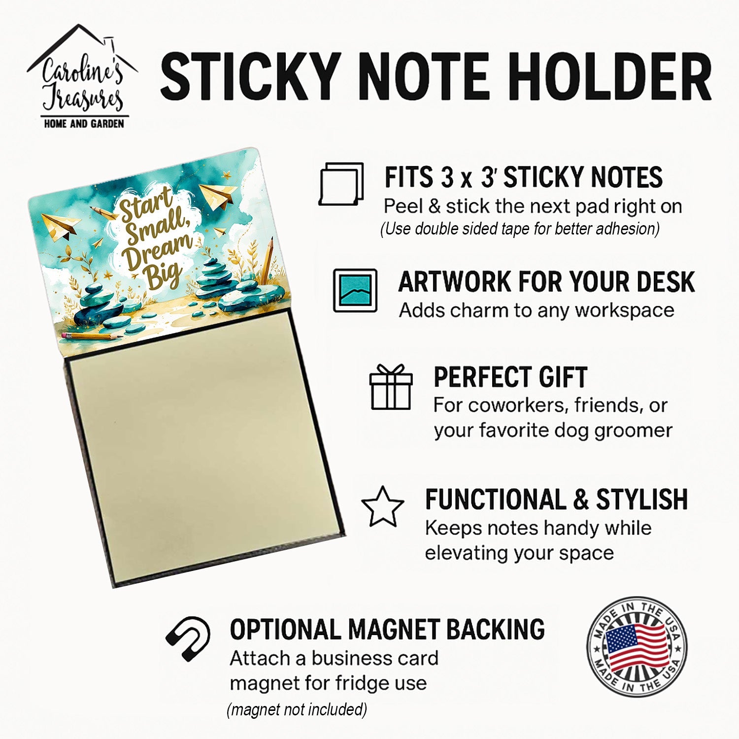 Celebrate the educators who inspire every day with this funny teacher sticky note holder from Caroline’s Treasures. Proudly made in the USA, each design features the phrase Start Small, Dream Big - in bold, colorful artwork that turns an everyday desk accessory into a thoughtful gift. The sturdy base holds 3" x 3" sticky notes securely while you write, and the glossy aluminum art plate adds a durable, fade-resistant finish that lasts. Refilling is easy—just roll a piece of tape around your finger, press it to the back sheet of a new pad, and attach it to the board. Ideal for classrooms, offices, or home desks, these note holders make a meaningful gift for Teacher Appreciation Week, back-to-school, end-of-year celebrations, or simply saying thank you.