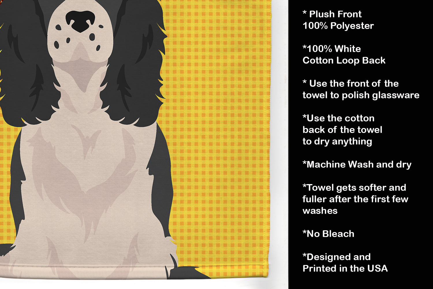 Decorate your space with our English Springer Spaniel artwork on a Kitchen Towel. Bring a bit of Summer into your home with a Summer Kitchen Towel. Experience the perfect blend of aesthetic appeal and functional excellence with our Plush Velour Kitchen Towels. These are not your ordinary decorative kitchen towels that gather dust. Instead, they are designed to be as practical as they are stylish. The front layer of our towel is constructed from a minky plush polyester, known for its durability and color retention. Unlike conventional kitchen towels, the artwork on our towels is dyed directly into the fabric, ensuring vibrant colors that last. Polish your glassware to a brilliant sparkle using the plush front side of the towel. Flip to the back, crafted from 100% cotton terry loop, to exploit its exceptional absorbency for drying dishes or wiping down counters. Our kitchen towels redefine the concept of functional art, offering lasting quality that maintains the towel's shape over time. Measuring 15 inches by 25 inches and weighing 2.3 lbs per dozen, these towels deliver an overwhelming sensory experience with their soft, plush, and smooth texture. The edges are meticulously finished with binding, enhancing their durability and visual appeal. For your convenience, these towels are machine washable and can be dried on low heat. After the first wash, the top fabric becomes even softer and fluffier, eliminating the need for ironing. Treat your kitchen to the luxury and functionality it deserves with our plush velour kitchen towels.