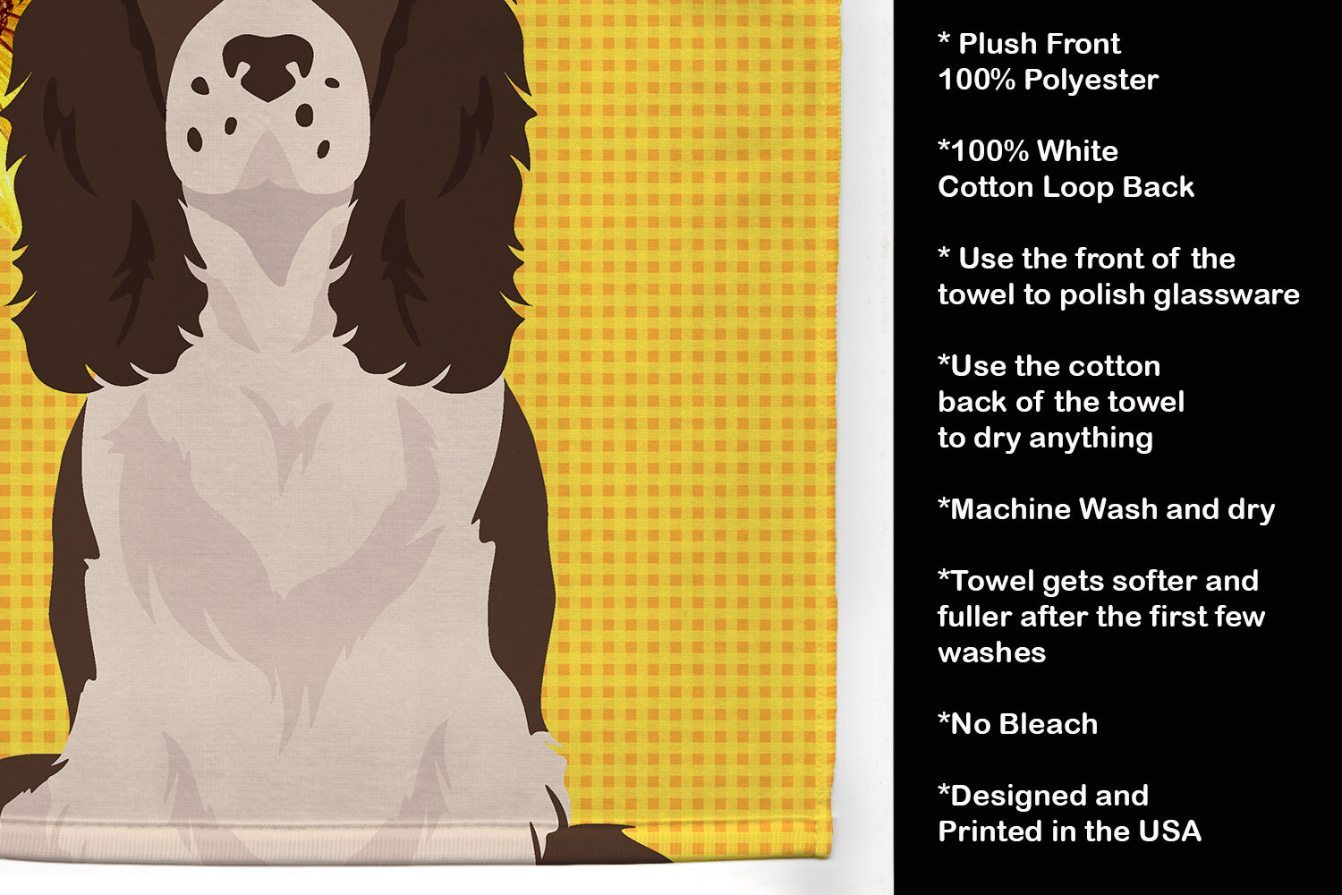 Decorate your space with our English Springer Spaniel artwork on a Kitchen Towel. Bring a bit of Summer into your home with a Summer Kitchen Towel. Experience the perfect blend of aesthetic appeal and functional excellence with our Plush Velour Kitchen Towels. These are not your ordinary decorative kitchen towels that gather dust. Instead, they are designed to be as practical as they are stylish. The front layer of our towel is constructed from a minky plush polyester, known for its durability and color retention. Unlike conventional kitchen towels, the artwork on our towels is dyed directly into the fabric, ensuring vibrant colors that last. Polish your glassware to a brilliant sparkle using the plush front side of the towel. Flip to the back, crafted from 100% cotton terry loop, to exploit its exceptional absorbency for drying dishes or wiping down counters. Our kitchen towels redefine the concept of functional art, offering lasting quality that maintains the towel's shape over time. Measuring 15 inches by 25 inches and weighing 2.3 lbs per dozen, these towels deliver an overwhelming sensory experience with their soft, plush, and smooth texture. The edges are meticulously finished with binding, enhancing their durability and visual appeal. For your convenience, these towels are machine washable and can be dried on low heat. After the first wash, the top fabric becomes even softer and fluffier, eliminating the need for ironing. Treat your kitchen to the luxury and functionality it deserves with our plush velour kitchen towels.