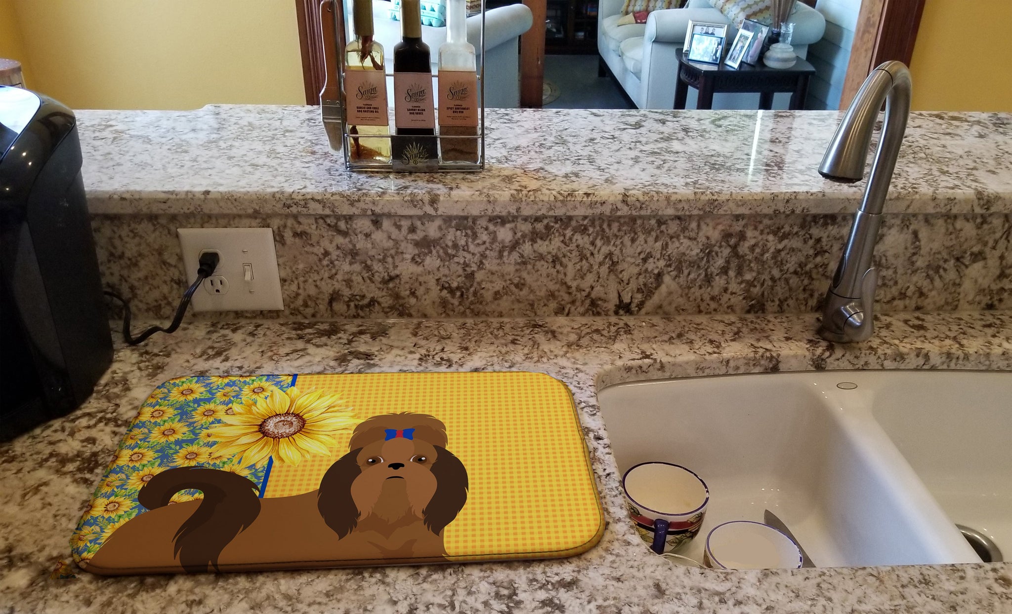 Decorate your space with our Shih Tzu artwork on a Dish Drying Mat. Bring a bit of Summer into your home with a Summer Dish Drying Mat. Say goodbye to messy countertops and soggy dish towels with our innovative dish drying mat. Our high-quality dish drying pad is designed to keep your countertops dry while offering a stylish and efficient solution. Whether you're air drying dishes, glasses, stemware, silverware, pots, pans, bottles, or even fruits and vegetables, our dish mat is the perfect choice. The 14 inches x 22 inches size fits most counters and dish drying racks, and the non-slip design ensures stability. Made with water-absorbent polyester and a polyurethane foam insert, our dish drying mat is not only functional but also durable. It's machine washable and printed in the USA for long-lasting use. The beautiful artwork adds flair to your kitchen decor, making it a perfect housewarming gift or present for any occasion. Upgrade your kitchen experience with our absorbent and versatile dish drying mat.