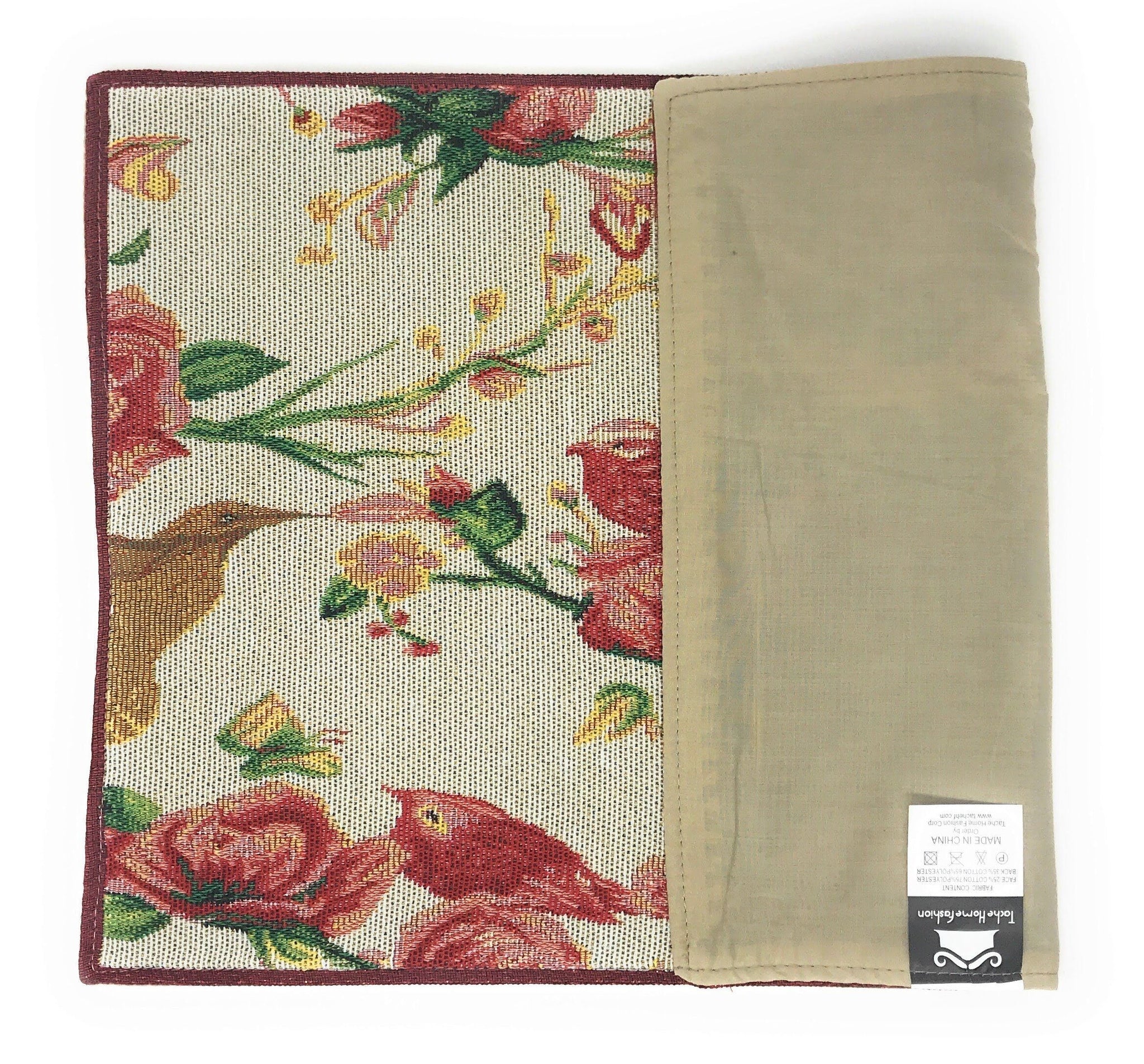 This placemat features a lovely floral print with small finches sitting on the rose flowers and ivory background.