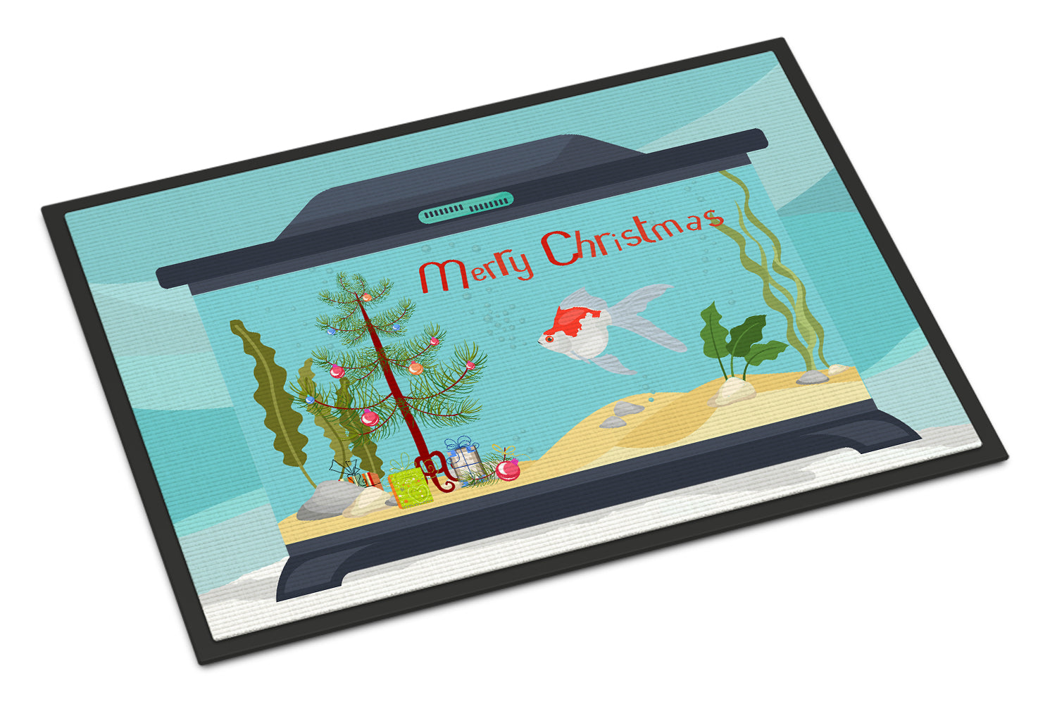 Decorate your space with our Christmas Tamasaba Goldfish artwork on a Doormat. Welcome your guests in style with our Artwork Door Mat, designed to withstand almost any weather condition. This mat, measuring approximately 24 by 36 inches, is held together by durable black binding tape. Its top layer, composed of polyester felt, is dyed with the eye-catching image you see on the mat. A few layers below provide the mat with stability, while its rubber bottom is stamped to help prevent slipping and ensures safety. Our mat works wonderfully as both an indoor or outdoor door mat. For cleaning, simply hose it off with water or use a power washer - no need for any cleaner that produces suds. Avoid scrubbing with a brush, instead, opt for the vacuum on floor setting. Designed manufactured and printed in the USA, this mat is a perfect addition to your porch, outdoor kitchen, entryway, or any indoor space. Its unique design makes it a charming decorative rug that greets your guests and adds a stylish touch to your home decor.