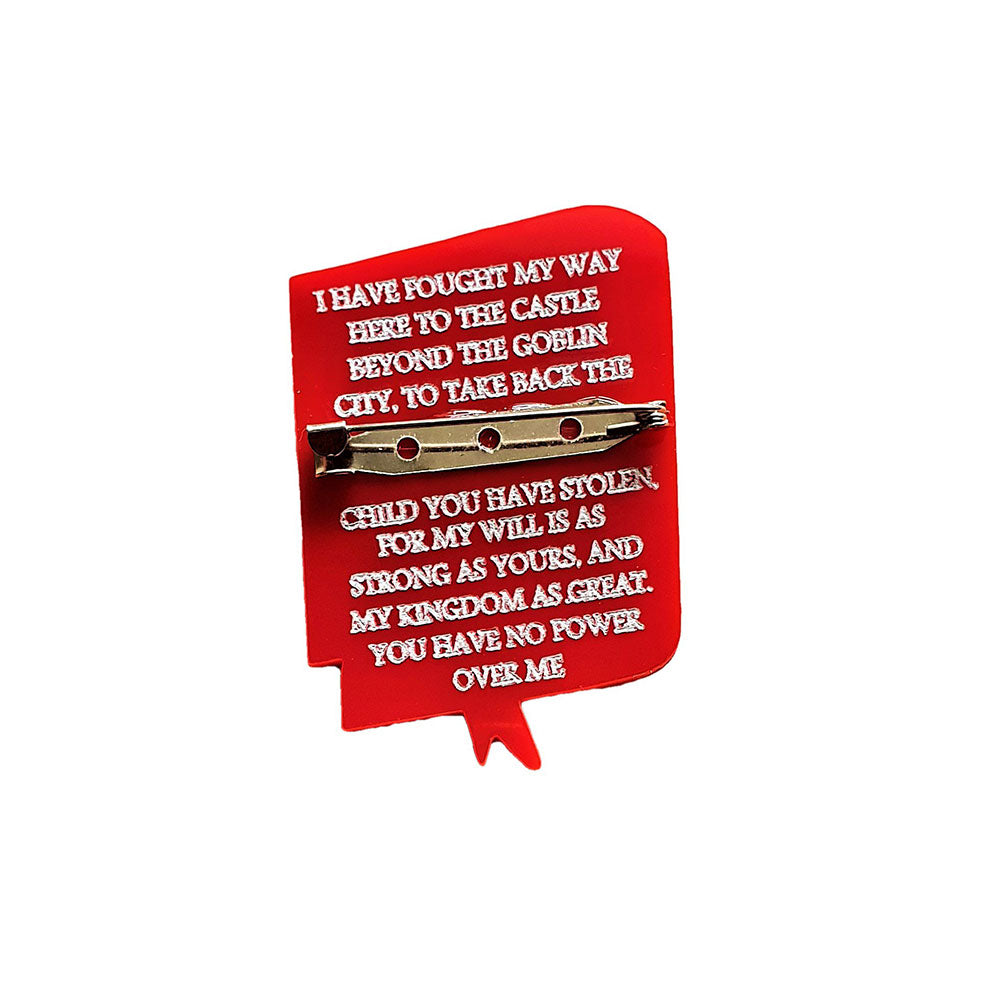 Our Labyrinth book inspired by the film is made from two layers of acrylic. The book surface is red marble with engraved and hand inked detail. It is double sided featuring an iconic quote from the film on the reverse. It measures 6 cm and is secured to an allergy free brooch back fastening.