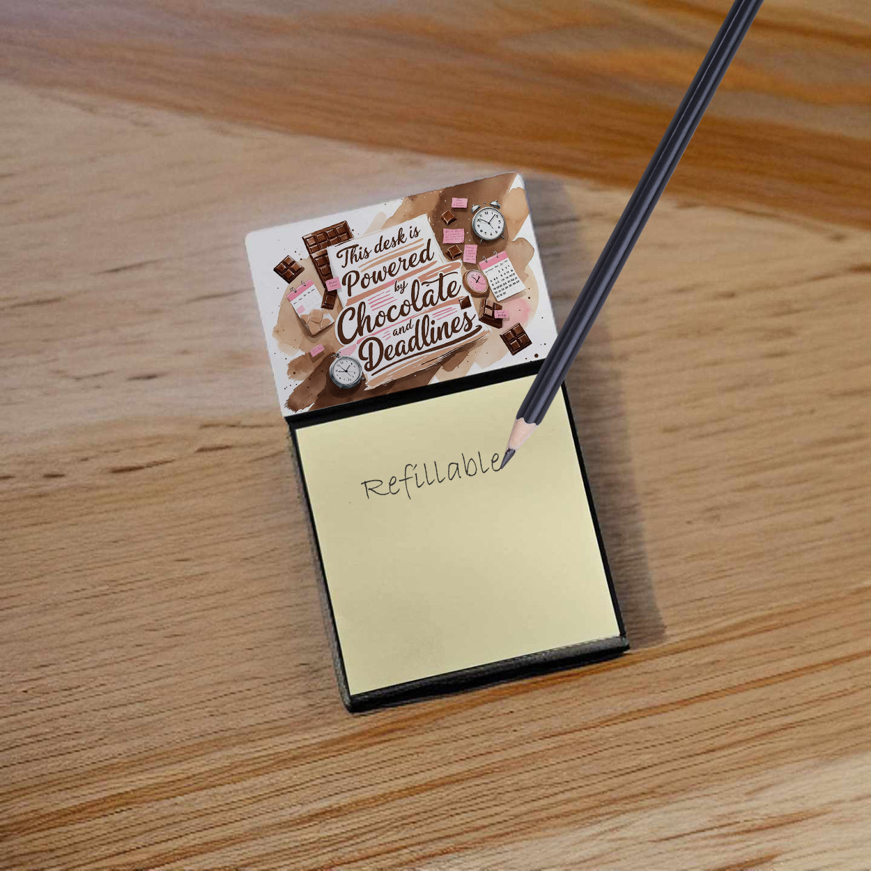 Celebrate the educators who inspire every day with this funny teacher sticky note holder from Caroline’s Treasures. Proudly made in the USA, each design features the phrase This Desk is Powered by Chocolate and Deadlines - in bold, colorful artwork that turns an everyday desk accessory into a thoughtful gift. The sturdy base holds 3" x 3" sticky notes securely while you write, and the glossy aluminum art plate adds a durable, fade-resistant finish that lasts. Refilling is easy—just roll a piece of tape around your finger, press it to the back sheet of a new pad, and attach it to the board. Ideal for classrooms, offices, or home desks, these note holders make a meaningful gift for Teacher Appreciation Week, back-to-school, end-of-year celebrations, or simply saying thank you.