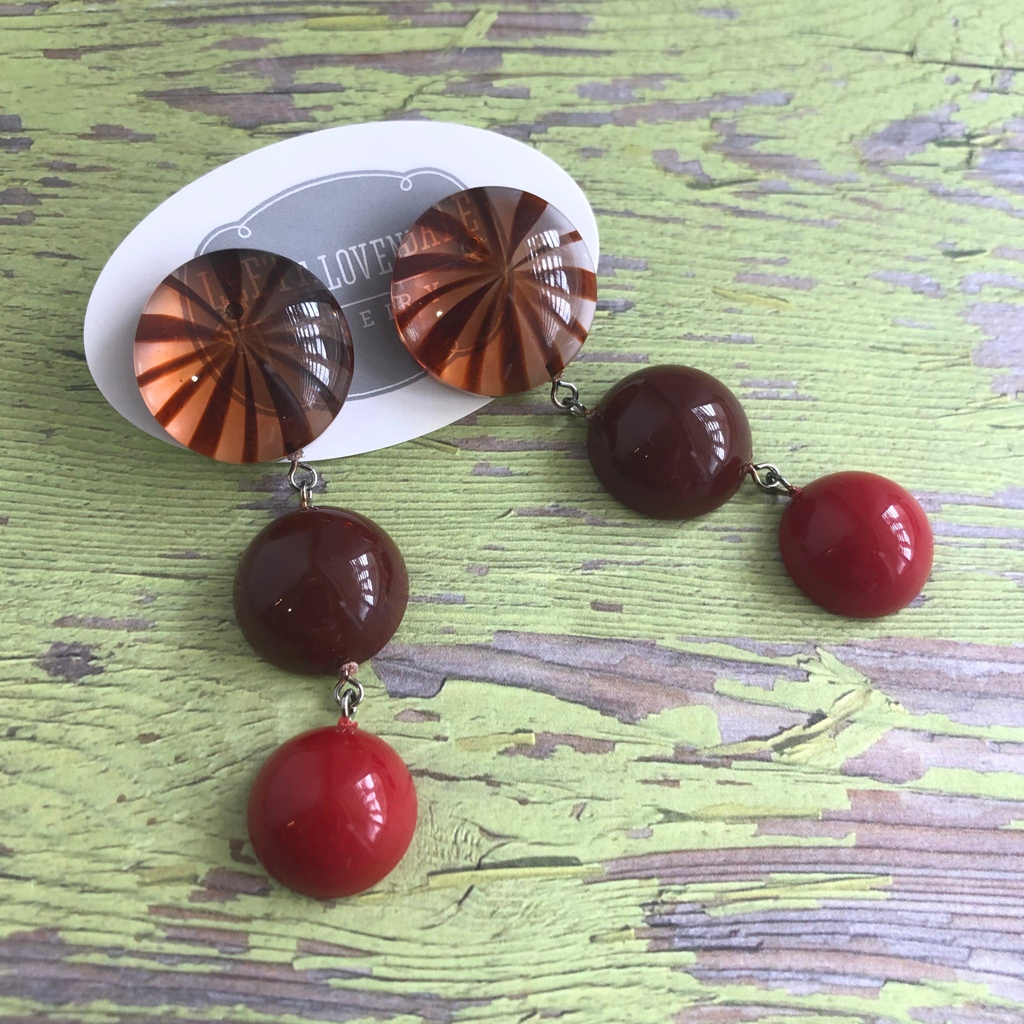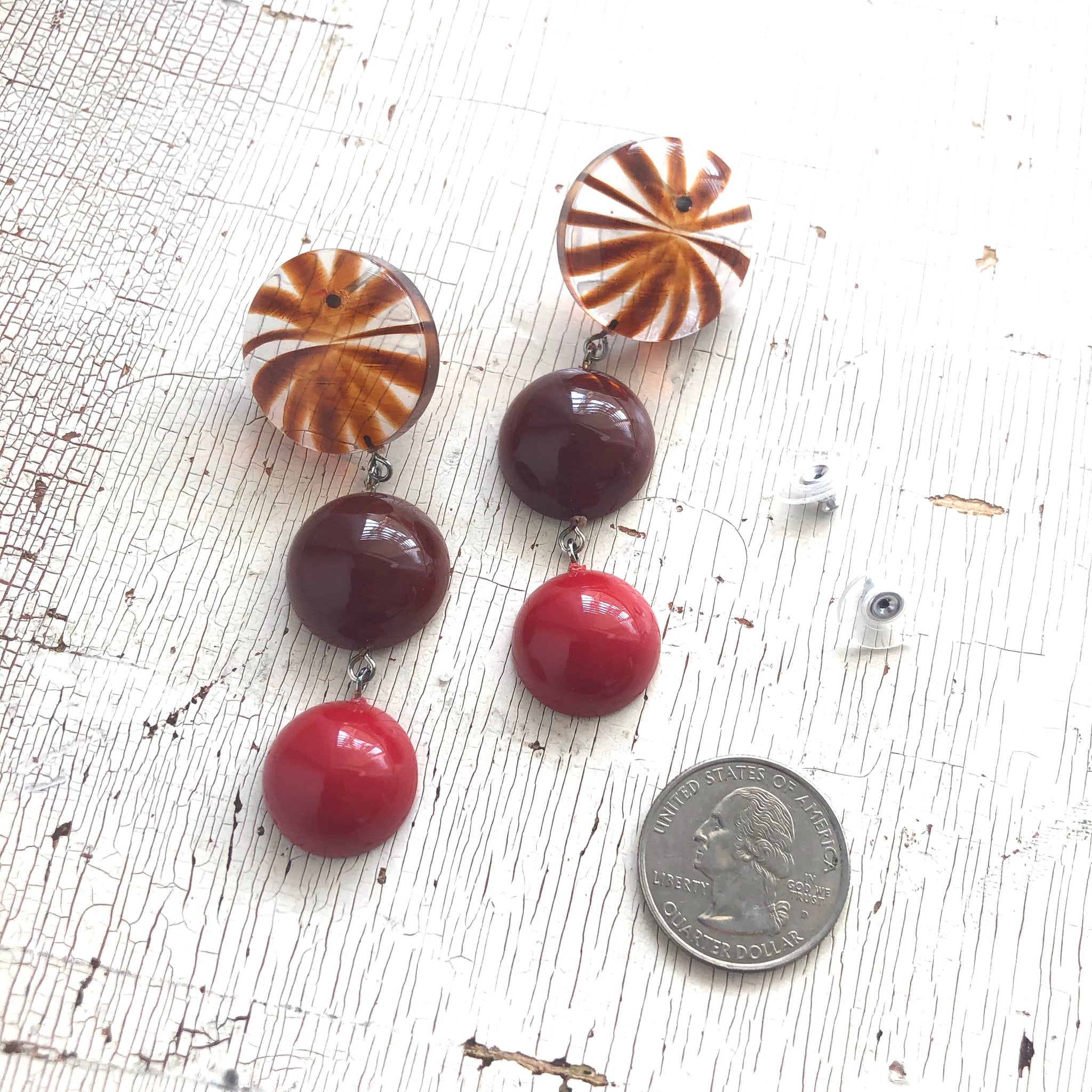 Tortoise & Clear starbursts meets carnelian & cherry red with a shiny finish. Triple domed discs connected with steel wire creating retro fantastic statement earrings. Check out the model wearing the standard tri dot sized earrings to give you an idea of the size & scale when worn.