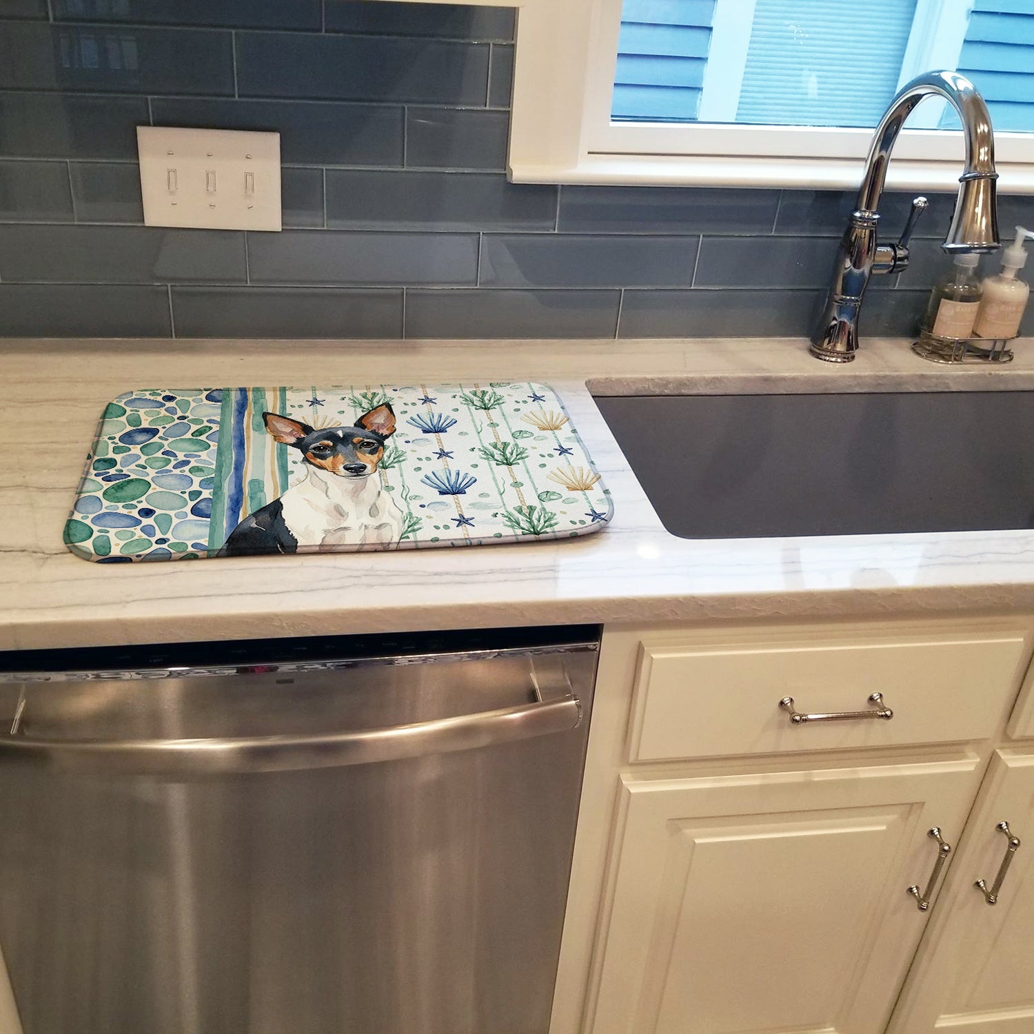Shown here is the Toy Fox Terrier Coastal Sea Glass Dish Drying Mat from Caroline's Treasures featuring artwork of a Toy Fox Terrier in a Everyday design. The detailed illustration and vibrant colors make it a standout accent that celebrates both seasonal style and love for the subject. This image features a calming coastal watercolor pattern with soft seashells, seaweed, starfish, and pebble-inspired accents arranged in a repeating design. The soothing palette of blues, greens, and sandy neutrals creates a relaxed, beach-inspired look that adds a fresh and tranquil feel to any space. Everyday décor celebrates personal style and the small moments that make a house feel like home. Thoughtful designs add warmth and personality that can be enjoyed year-round. Say goodbye to messy countertops and soggy dish towels with our innovative dish drying mat. Our high-quality dish drying pad is designed to keep your countertops dry while offering a stylish and efficient solution. Whether you're air drying dishes, glasses, stemware, silverware, pots, pans, bottles, or even fruits and vegetables, our dish mat is the perfect choice. The 14 inches x 21 inches size fits most counters and dish drying racks, and the non-slip design ensures stability. Made with water-absorbent polyester and a polyurethane foam insert, our dish drying mat is not only functional but also durable. It's machine washable and printed in the USA for long-lasting use. The beautiful artwork adds flair to your kitchen decor, making it a perfect housewarming gift or present for any occasion. Upgrade your kitchen experience with our absorbent and versatile dish drying mat. Perfect for: Kitchen counters and sinks, everyday dish drying and countertop protection, Dogs-themed homes, or year-round use for Toy Fox Terrier lovers. Toy Fox Terriers are small dogs with smooth coats and alert expressions. Their appearance feels lively and confident. Makes a heartfelt gift for: Toy Fox Terrier owners, Dogs lovers, Everyday gifts, pet parents, friends who adore their Toy Fox Terrier, or anyone celebrating Dogs.