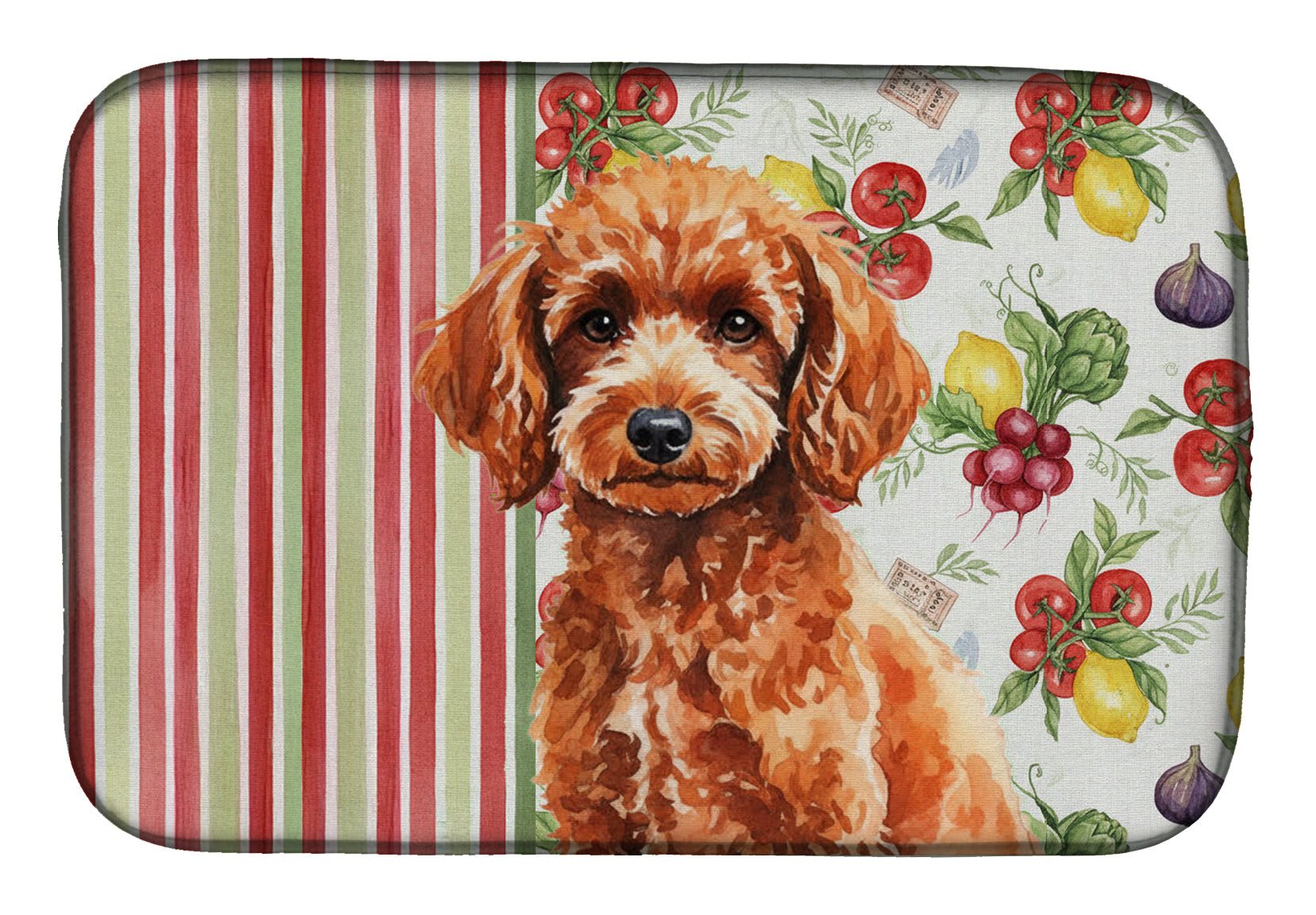 Shown here is the Toy Red Poodle Vegetables Dish Drying Mat from Caroline's Treasures featuring artwork of a Poodle in a Everyday design. The detailed illustration and vibrant colors make it a standout accent that celebrates both seasonal style and love for the subject. This image features a vibrant watercolor vegetable pattern with tomatoes, lemons, artichokes, figs, radishes, and leafy greens arranged in a repeating design, paired with classic red and green stripes. The bright, garden-fresh palette creates a cheerful, farmhouse-inspired look that feels lively, welcoming, and perfect for kitchen décor. Everyday décor celebrates personal style and the small moments that make a house feel like home. Thoughtful designs add warmth and personality that can be enjoyed year-round. Say goodbye to messy countertops and soggy dish towels with our innovative dish drying mat. Our high-quality dish drying pad is designed to keep your countertops dry while offering a stylish and efficient solution. Whether you're air drying dishes, glasses, stemware, silverware, pots, pans, bottles, or even fruits and vegetables, our dish mat is the perfect choice. The 14 inches x 21 inches size fits most counters and dish drying racks, and the non-slip design ensures stability. Made with water-absorbent polyester and a polyurethane foam insert, our dish drying mat is not only functional but also durable. It's machine washable and printed in the USA for long-lasting use. The beautiful artwork adds flair to your kitchen decor, making it a perfect housewarming gift or present for any occasion. Upgrade your kitchen experience with our absorbent and versatile dish drying mat. Perfect for: Kitchen counters and sinks, everyday dish drying and countertop protection, Dogs-themed homes, or year-round use for Poodle lovers. Poodles are highly intelligent dogs known for their elegance and versatility. Available in standard, miniature, and toy sizes, this breed is admired for its trainability and loyalty. Makes a heartfelt gift for: Poodle owners, Dogs lovers, Everyday gifts, pet parents, friends who adore their Poodle, or anyone celebrating Dogs.
