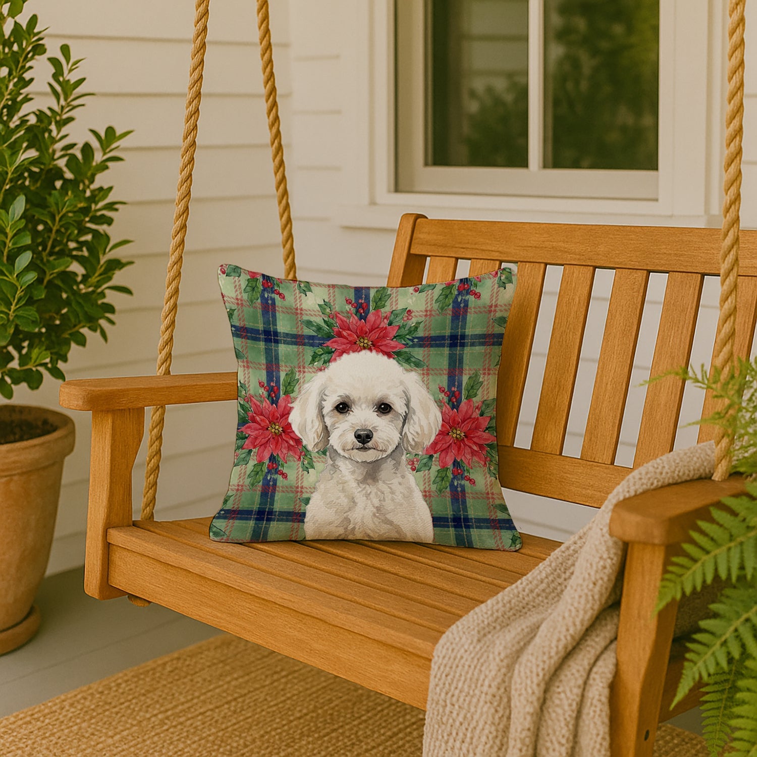 Throw Pillow featuring breed specific Poodle artwork. Celebrate Christmas with this Christmas Pillow. Revitalize your outdoor or indoor living space with Caroline's Treasures 18x18 Fabric Decorative Pillow. With a generously sized dimension of approximately 18 inches by 18 inches, this pillow makes a comfortable and aesthetic addition to any seating area. Made from a unique, water-resistant material developed by Caroline's Treasures, the pillow sham is 100% polyester fabric that's durable and ready to weather any condition. Its vibrant, full-color artwork will not fade over time as it is dyed with color-fast dyes. Whether you place it on your patio furniture, porch, veranda, or indoor couch, its soft canvas fabric ensures a cozy experience. The pillow is handcrafted in the United States, featuring a sham created from three pieces of fabric and a polyester insert for enduring shape and overstuffed comfort. Despite being robustly built to endure the outdoors, it is as soft and snug as your favorite indoor cushions. Please note, as all our pillows are handmade, sizes may vary slightly, adding to the charm of this unique decorative item.