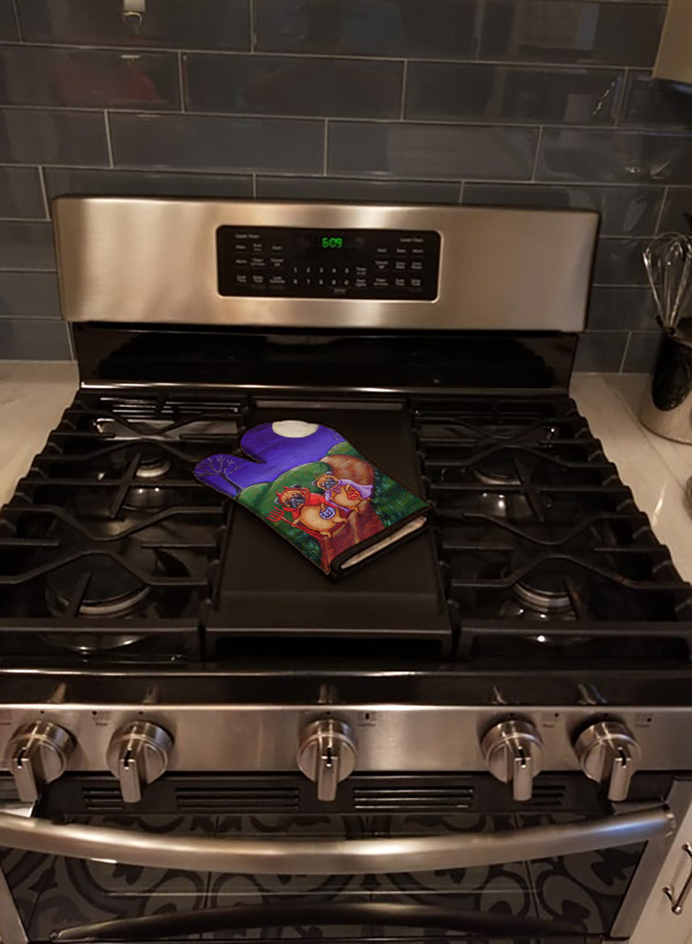 Decorate your space with our Halloween Pug artwork on a Oven Mitt. Presenting our Large Right Hand Thick Heat Resistant Oven Mitt, an indispensable tool for any culinary enthusiast. This mitt boasts layers of quilted protection on both sides, providing outstanding resistance against extreme heat. Embellished with beautifully printed artwork, it adds an extra dash of charm to your kitchen decor. At about 12 inches long and 8 1/2 inches wide, this oven mitt offers a generous fit, accommodating a diverse range of hand sizes. Its design is enhanced by a sleek Black bias tape trim, finished with a convenient hoop for easy hanging. Fresh out of the packaging, the quilting process may give the mitt a stiff feel, but rest assured, it will soften with use and washing. Our mitt is crafted with a unique center fabric, Insul-Bright, a composite material made from polyester fibers, needle-punched through a nonwoven substrate and a reflective metallized film. This smart material resists both conduction and radiant energy, reflecting heat back to its source, all while remaining breathable. Our oven mitt is machine washable and safe for tumble drying. It's a perfect gift for your favorite Chef, BBQ enthusiast, or just a little treat for yourself! Experience safety, style, and convenience rolled into one with this exceptional oven mitt.
