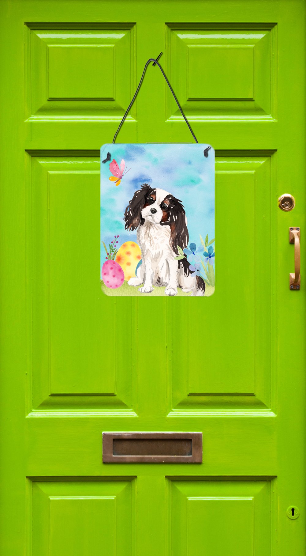 Decorate your space with our Easter Cavalier King Charles Spaniel artwork on a Metal Print. Spruce up your space with our Indoor or Outdoor Aluminum Artwork Prints. Designed to brighten your kitchen, bathroom, office, or outdoor areas like patios and porches, these prints offer a unique way to decorate your home or workspace. Measuring 12 by 16 inches, the prints are vibrant, full color, and bring an element of artistry to any setting. What makes these prints special is their durability and resistance to the elements. If placed outside, they can withstand direct sunlight for a considerable time before showing signs of fading. Crafted from rust and fade-resistant aluminum, these prints are built to last and maintain their vibrant colors. Each print comes with a black hanging rope and rounded corners for safety. The back of the print showcases a brushed silver color, adding a touch of sophistication. The lightweight design allows easy hanging with virtually any nail or screw, making installation a breeze. Whether indoors or outdoors, these prints add a distinctive touch to any space.