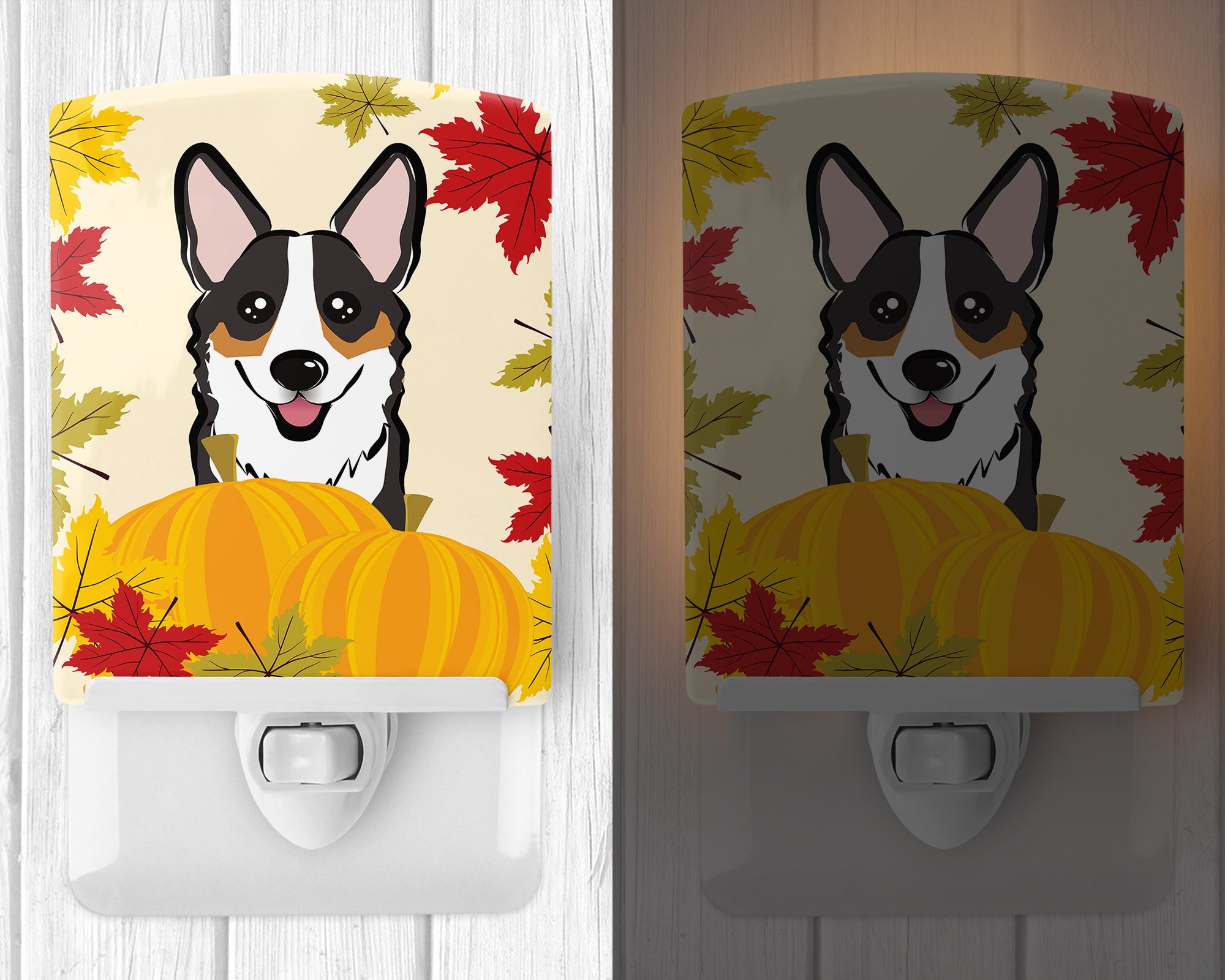 Decorate your space with our Thanksgiving Corgi artwork on a Night Light. Introduce a splash of artistic flair and subtle illumination to your space with the Decorative Ceramic Night Light from Caroline's Treasures. Perfect for any room, this night light seamlessly blends functionality with an aesthetic appeal, offering a stylish solution to brighten up dark corners of your home or office. Boasting a six-inch high by four-inch wide ceramic tile at the front, it showcases vivid, full-color artwork from distinguished artists, transforming a simple utility into a vibrant art piece. The artwork is securely encased in a robust metal holder, ensuring durability and longevity. Two screws are provided to firmly affix the tile into the holder. The holder extends three inches deep, housing an included bulb that emits a soft, welcoming glow. This product meets all safety standards, as evidenced by its UL approval. Proudly made in the United States from imported components, this Decorative Ceramic Night Light is not just a functional device; it's a statement piece that enhances the ambiance of your surroundings.