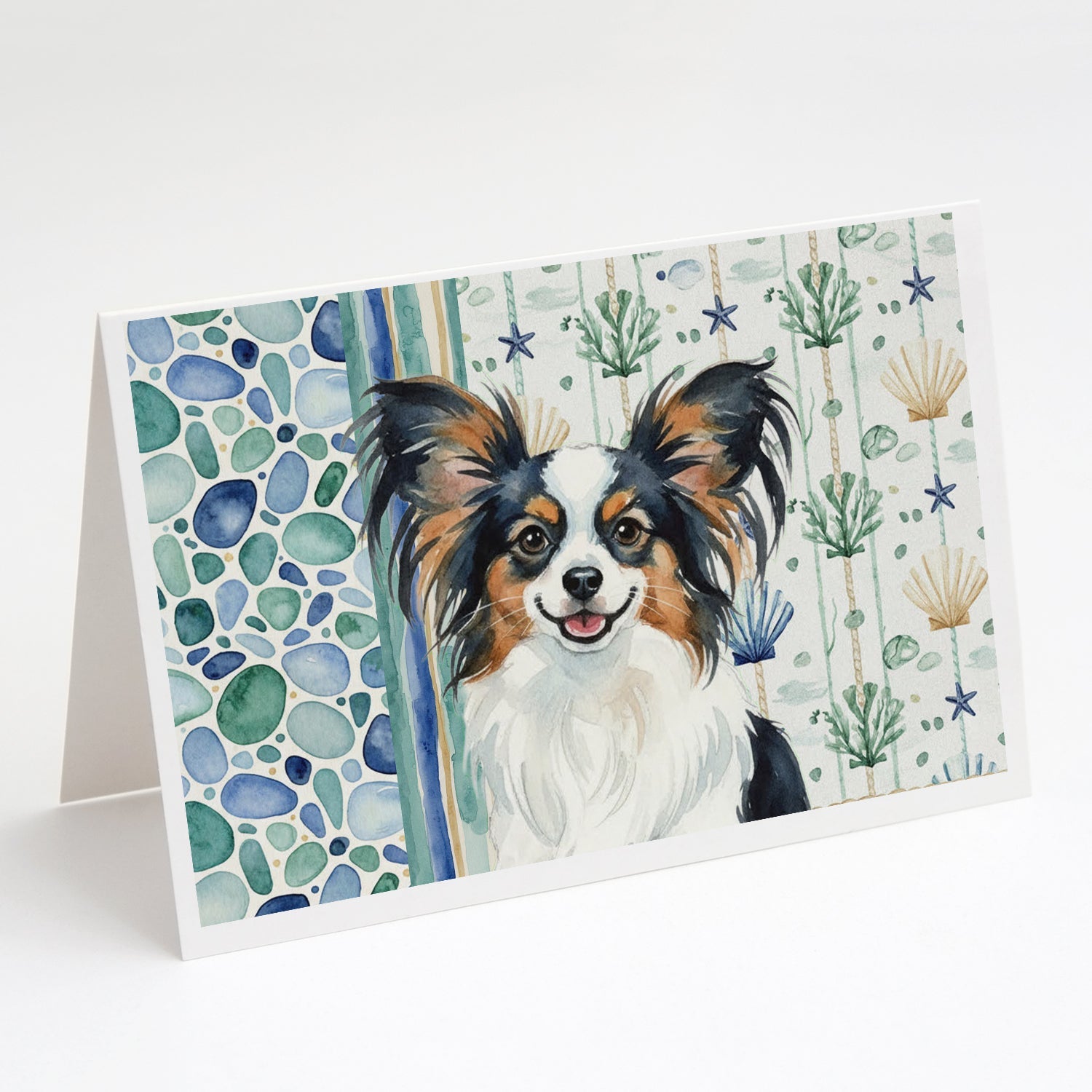 Shown here is the Tricolor Papillon Coastal Sea Glass Greeting Cards Pack of 8 from Caroline's Treasures featuring artwork of a Papillon in a Everyday design. The detailed illustration and vibrant colors make it a standout accent that celebrates both seasonal style and love for the subject. This image features a calming coastal watercolor pattern with soft seashells, seaweed, starfish, and pebble-inspired accents arranged in a repeating design. The soothing palette of blues, greens, and sandy neutrals creates a relaxed, beach-inspired look that adds a fresh and tranquil feel to any space. Everyday décor celebrates personal style and the small moments that make a house feel like home. Thoughtful designs add warmth and personality that can be enjoyed year-round. Celebrate special moments with Caroline's Treasures Printed Greeting Card Pack. This pack includes eight beautifully folded 5x7 cards, accompanied by eight matching white envelopes. With blank interiors, these cards provide ample space for your personalized messages and heartfelt holiday greetings. Each card features captivating full-color artwork, meticulously printed in our facility on high-quality 80 lb cover stock or 216 GSM. The super smooth finish of the white cards enhances the visual impact of the artwork, creating a truly stunning presentation. Designed by our talented in-house artists or licensed artists, the artwork on these cards showcases their creativity and attention to detail. From vibrant illustrations to captivating designs, each card tells its own unique story. Whether it's for birthdays, anniversaries, holidays, or any special occasion, Caroline's Treasures Greeting Card Pack is the perfect way to convey your heartfelt sentiments. Share joy, love, and warm wishes with these exquisite cards and make every moment unforgettable. Perfect for: Writing personal messages, everyday correspondence, and thoughtful notes, Dogs-themed stationery collections, or year-round use for Papillon lovers. Papillons are small companion dogs known for their butterfly-like ears and lively personality. This breed is loved for its intelligence, alertness, and affectionate nature. Makes a heartfelt gift for: Papillon owners, Dogs lovers, Everyday gifts, pet parents, friends who adore their Papillon, or anyone celebrating Dogs.