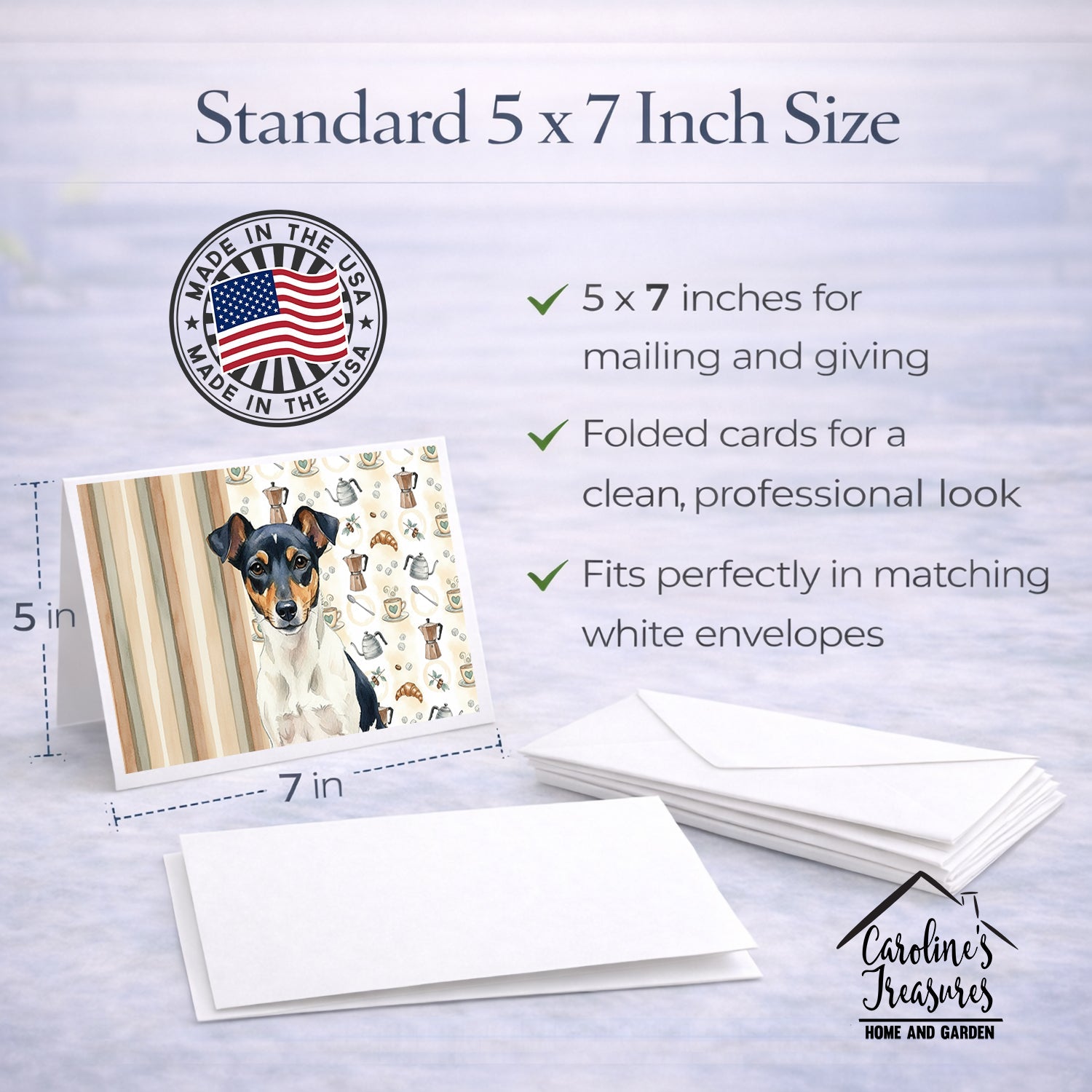 Shown here is the Tricolor Rat Terrier Coffee Bar Greeting Cards Pack of 8 from Caroline's Treasures featuring artwork of a Rat Terrier in a Everyday design. The detailed illustration and vibrant colors make it a standout accent that celebrates both seasonal style and love for the subject. This image features a cozy watercolor coffee-themed pattern with illustrated mugs, moka pots, kettles, croissants, coffee beans, and sugar cubes arranged in a repeating design. Soft neutral tones with warm browns, creams, and subtle sage accents create an inviting, café-inspired look that feels comforting and relaxed. Everyday décor celebrates personal style and the small moments that make a house feel like home. Thoughtful designs add warmth and personality that can be enjoyed year-round. Celebrate special moments with Caroline's Treasures Printed Greeting Card Pack. This pack includes eight beautifully folded 5x7 cards, accompanied by eight matching white envelopes. With blank interiors, these cards provide ample space for your personalized messages and heartfelt holiday greetings. Each card features captivating full-color artwork, meticulously printed in our facility on high-quality 80 lb cover stock or 216 GSM. The super smooth finish of the white cards enhances the visual impact of the artwork, creating a truly stunning presentation. Designed by our talented in-house artists or licensed artists, the artwork on these cards showcases their creativity and attention to detail. From vibrant illustrations to captivating designs, each card tells its own unique story. Whether it's for birthdays, anniversaries, holidays, or any special occasion, Caroline's Treasures Greeting Card Pack is the perfect way to convey your heartfelt sentiments. Share joy, love, and warm wishes with these exquisite cards and make every moment unforgettable. Perfect for: Writing personal messages, everyday correspondence, and thoughtful notes, Dogs-themed stationery collections, or year-round use for Rat Terrier lovers. Rat Terriers are energetic dogs known for their intelligence and adaptability. This versatile breed is admired for its loyalty, alertness, and strong companionship. Makes a heartfelt gift for: Rat Terrier owners, Dogs lovers, Everyday gifts, pet parents, friends who adore their Rat Terrier, or anyone celebrating Dogs.