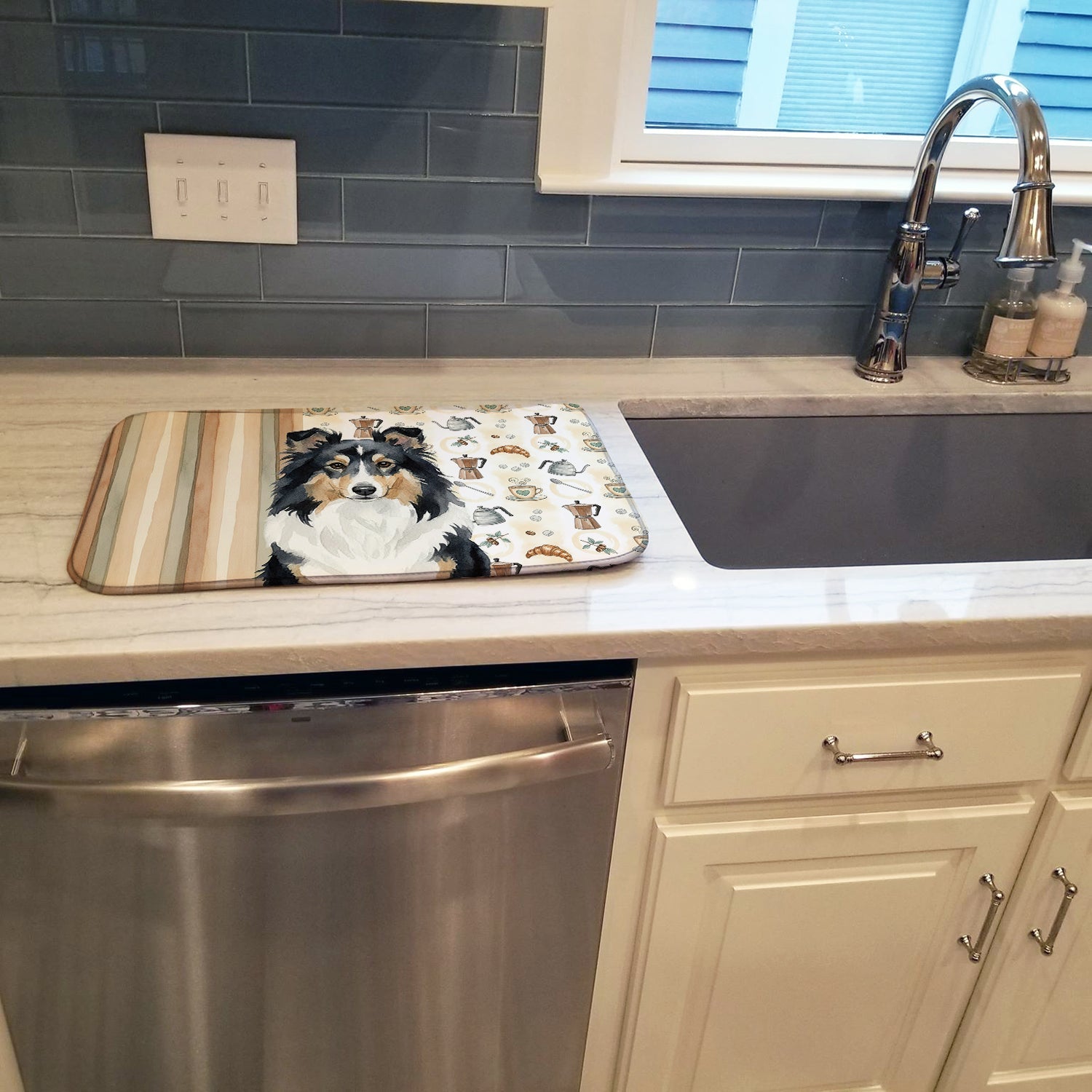 Shown here is the Tricolor Sheltie Coffee Bar Dish Drying Mat from Caroline's Treasures featuring artwork of a Sheltie Shetland Sheepdog in a Everyday design. The detailed illustration and vibrant colors make it a standout accent that celebrates both seasonal style and love for the subject. This image features a cozy watercolor coffee-themed pattern with illustrated mugs, moka pots, kettles, croissants, coffee beans, and sugar cubes arranged in a repeating design. Soft neutral tones with warm browns, creams, and subtle sage accents create an inviting, café-inspired look that feels comforting and relaxed. Everyday décor celebrates personal style and the small moments that make a house feel like home. Thoughtful designs add warmth and personality that can be enjoyed year-round. Say goodbye to messy countertops and soggy dish towels with our innovative dish drying mat. Our high-quality dish drying pad is designed to keep your countertops dry while offering a stylish and efficient solution. Whether you're air drying dishes, glasses, stemware, silverware, pots, pans, bottles, or even fruits and vegetables, our dish mat is the perfect choice. The 14 inches x 21 inches size fits most counters and dish drying racks, and the non-slip design ensures stability. Made with water-absorbent polyester and a polyurethane foam insert, our dish drying mat is not only functional but also durable. It's machine washable and printed in the USA for long-lasting use. The beautiful artwork adds flair to your kitchen decor, making it a perfect housewarming gift or present for any occasion. Upgrade your kitchen experience with our absorbent and versatile dish drying mat. Perfect for: Kitchen counters and sinks, everyday dish drying and countertop protection, Dogs-themed homes, or year-round use for Sheltie Shetland Sheepdog lovers. Shetland Sheepdogs feature long coats and refined builds. Their appearance reflects grace and intelligence. Makes a heartfelt gift for: Sheltie Shetland Sheepdog owners, Dogs lovers, Everyday gifts, pet parents, friends who adore their Sheltie Shetland Sheepdog, or anyone celebrating Dogs.