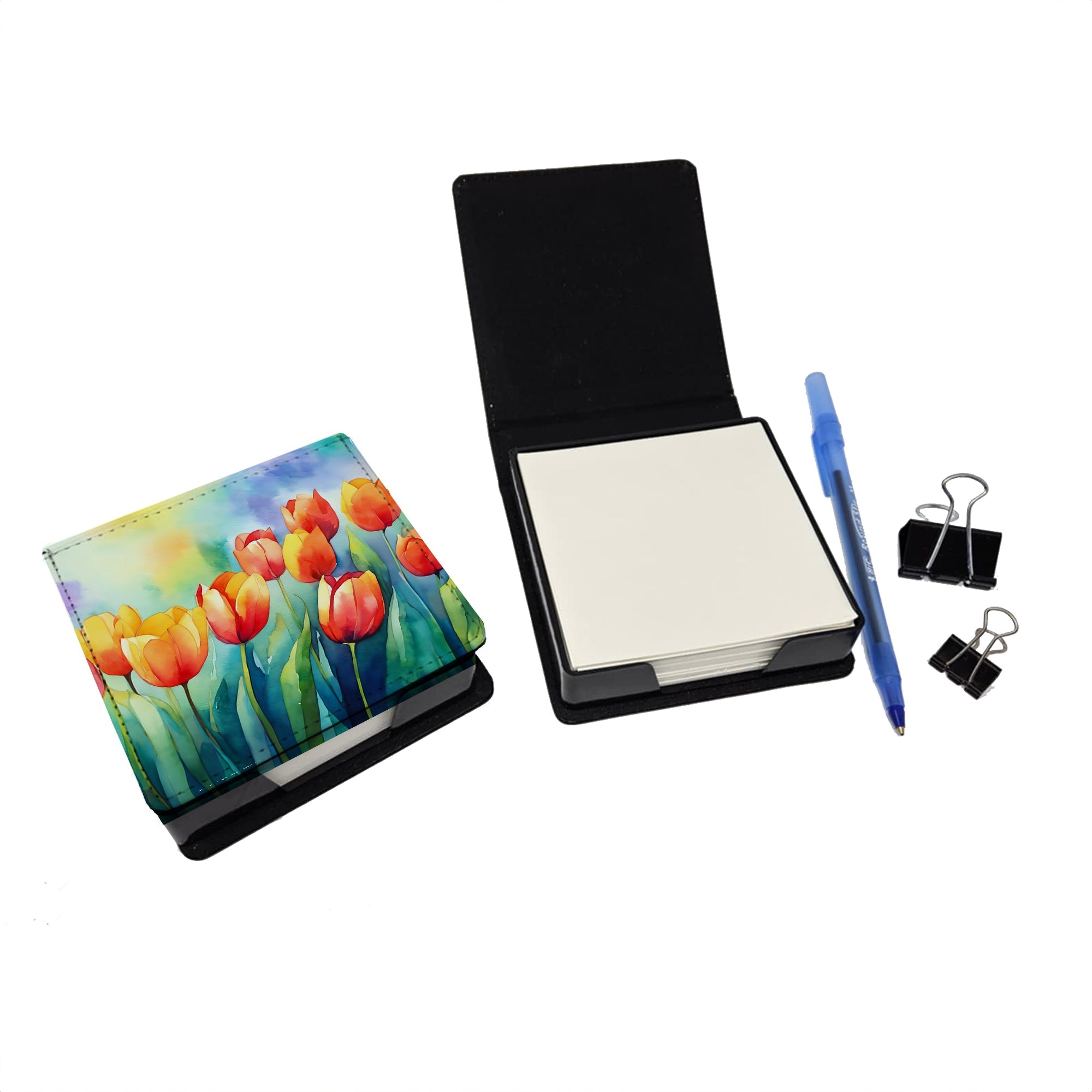 PU Leather Note Paper Holder featuring breed specific Tulips artwork. Elevate your workspace with this PU Leather Note Paper Holder, crafted to resemble luxurious leather without the use of animal products. Made from durable synthetic PU leather, it offers both a premium look and eco-friendly appeal. This note holder, compactly sized at 4.25 x 4.25 x 1.25 inches, includes about 160 sheets of 3.75 x 3.75-inch note paper—ideal for quick notes and reminders. An exclusive artist-designed cover makes each holder uniquely vibrant, adding a splash of color and personality to any desk or office. The discrete design keeps note paper hidden, maintaining a neat and organized workspace. Perfect as a gift or for personal use, this stylish holder is refillable with standard paper, ensuring long-lasting utility. A must-have for anyone seeking a sophisticated, artful touch to their workspace while supporting animal-friendly products. Add style, organization, and creativity to your everyday routine with this elegant note paper holder.
