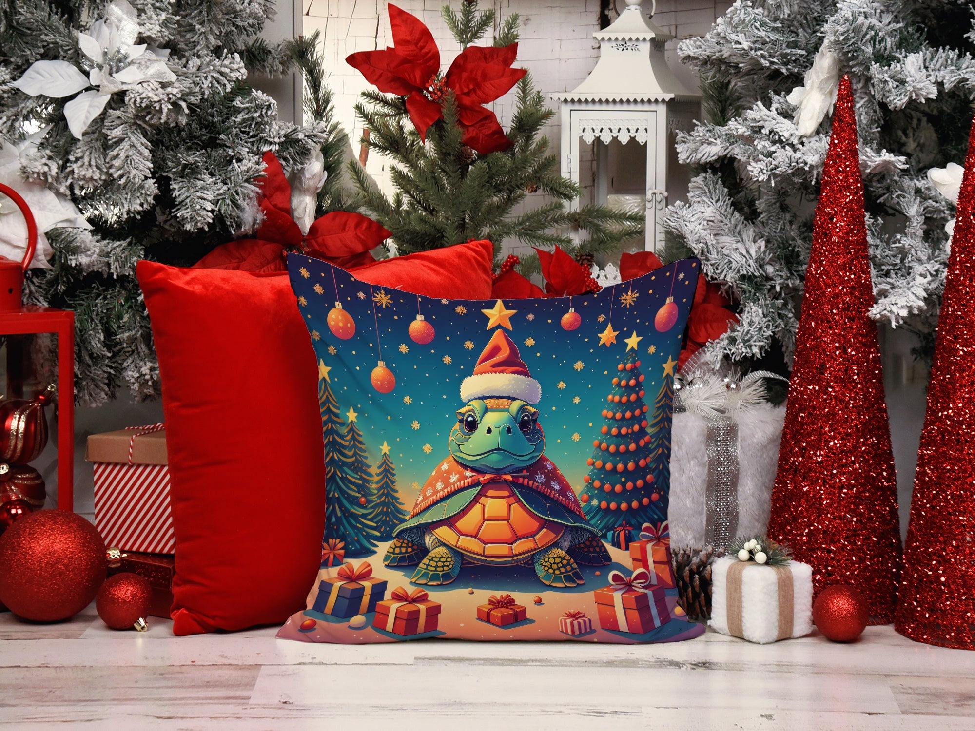 Decorate your space with our Christmas Turtle artwork on a Pillow. Revitalize your outdoor or indoor living space with Caroline's Treasures 18x18 Fabric Decorative Pillow. With a generously sized dimension of approximately 18 inches by 18 inches, this pillow makes a comfortable and aesthetic addition to any seating area. Made from a unique, water-resistant material developed by Caroline's Treasures, the pillow sham is 100% polyester fabric that's durable and ready to weather any condition. Its vibrant, full-color artwork will not fade over time as it is dyed with color-fast dyes. Whether you place it on your patio furniture, porch, veranda, or indoor couch, its soft canvas fabric ensures a cozy experience. The pillow is handcrafted in the United States, featuring a sham created from three pieces of fabric and a polyester insert for enduring shape and overstuffed comfort. Despite being robustly built to endure the outdoors, it is as soft and snug as your favorite indoor cushions. Please note, as all our pillows are handmade, sizes may vary slightly, adding to the charm of this unique decorative item.