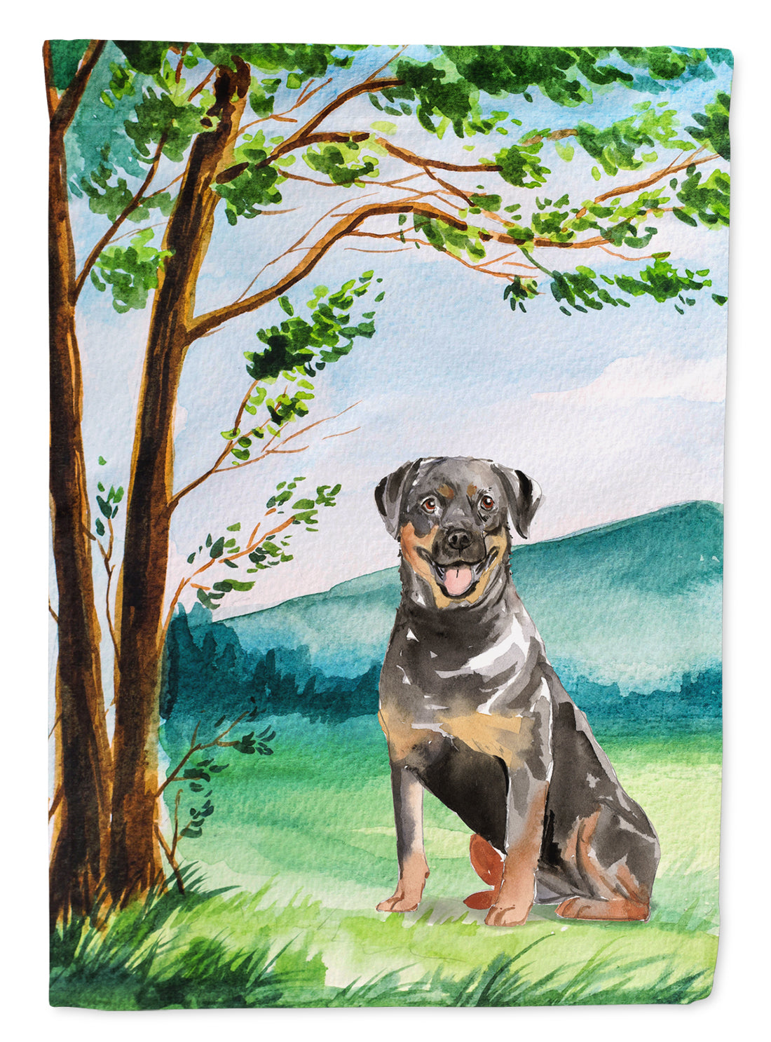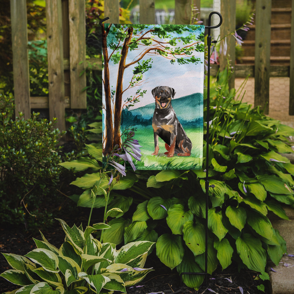 Decorate your space with our Rottweiler artwork on a Garden Flag. Bring a bit of Spring into your home with a Spring Garden Flag. Enhance the beauty of your garden, patio, or yard with Caroline's Treasures Decorative Garden Flag, proudly made in the USA. Crafted from two pieces of thick, double-sided polyester fabric, this 2-ply garden flag is designed to withstand various weather conditions, making it water-resistant and weatherproof. Featuring correctly readable words on both sides, this garden flag offers a delightful visual experience from any angle. With its heavier weight, it stands out among other garden flags, ensuring stability and durability even in wind, rain, and snow. Measuring approximately 11 1/4 inches by 15 1/2 inches, this flag allows you to personalize your outdoor decor. It comes with a 1 1/2-inch sleeve sewn in, allowing easy attachment to any standard garden flag stand or garden size porch hanger (sold separately). Make a statement in your outdoor space with Caroline's Treasures Decorative Garden Flag, a vibrant and high-quality flag that adds color and personality to your surroundings. Proudly made in the USA, it's a symbol of quality craftsmanship and attention to detail.