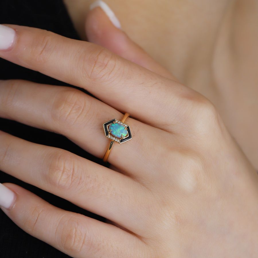 Unique Design Australian Semi Black Opal & Diamond Black Agate Engagement Ring 18K Yellow Gold.
