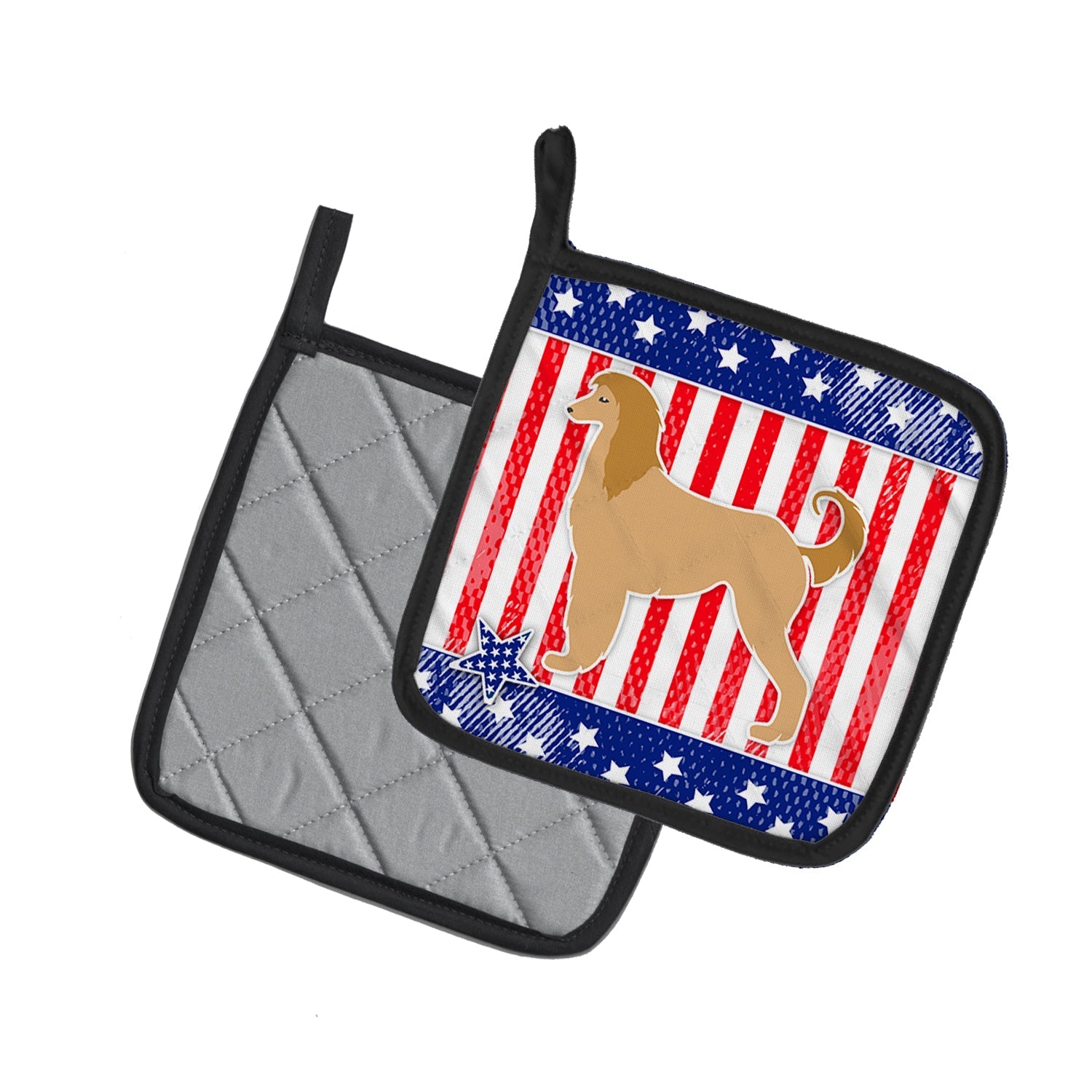 Decorate your space with our Afghan Hound artwork on a Pair of Pot Holders. A Pair of Pot Holders to match your kitchen decor. Made in the USA these are thick and functional. Full color artwork decorates the front polyester fabric of the hot pad and accented by a black trim. Use these at as a trivet for your Thanksgiving or Christmas tablescape. Filled with insulated fabric and quilted for durability. These colorful pot holders will make a great gift for your favorite home cook or executive chef. Each pot holder measures approximately 7 1/2 inches by 7 1/2 inches. A hanging tab is included.