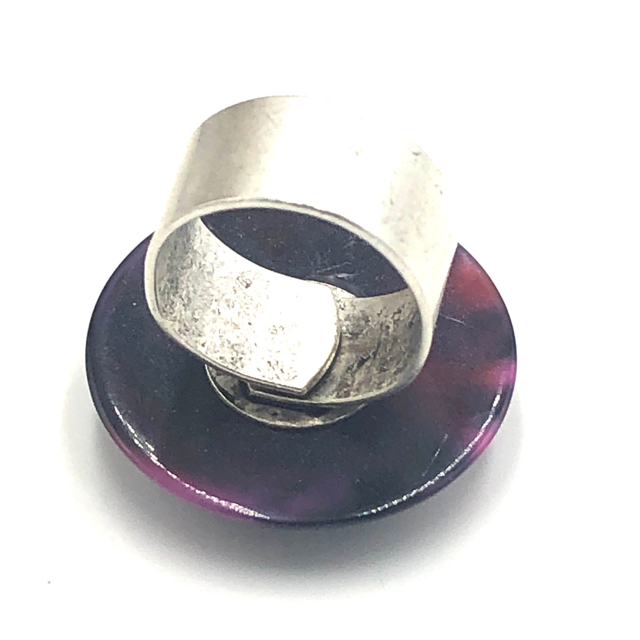 Deep dark navy blue meets violet in this marbled vintage lucite stone. Layered on a fine silver adjustable ring black, this 'stone' measures just about 30mm. Made with a matte antique silver base AND adjustable. Fits all or most sizes. The plating on the band is made with .999 fine silver over brass and is 9.5mm wide.