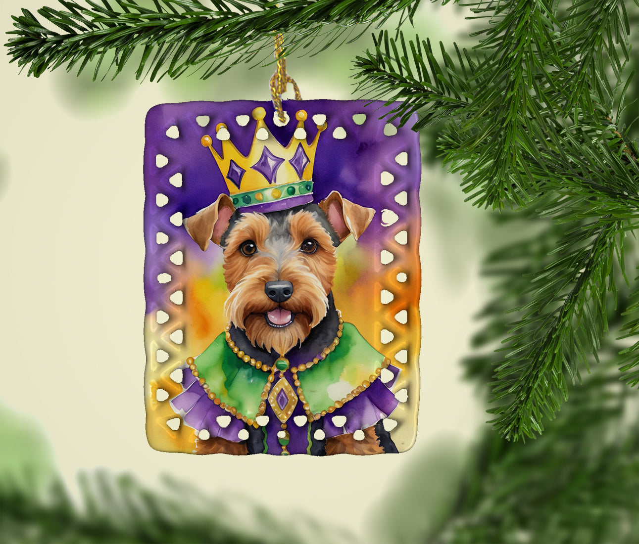 Porcelain Ornament featuring breed specific Welsh Terrier artwork. Celebrate Mardi Gras with this Mardi Gras Ornament. Add a unique, personal touch to your holiday decor with our Rectangular Lattice Porcelain Ornament. Perfect for creating cherished memories, this high-quality ornament shines under festive lights, reflecting warmth and joy throughout your Christmas tree. Crafted with a glossy finish, it showcases vibrant, full-color artwork contributed by our talented artists, ensuring your tree is adorned with a burst of color and holiday spirit. What sets this Porcelain Ornament apart is its customizable white back. Use a paint pen or permanent marker to write a heartfelt message, commemorate a special year, or mark an unforgettable date, turning this ornament into a keepsake that will be treasured for years to come. For best results, allow any personalization to dry thoroughly before handling. Each ornament comes complete with a delicate gold cord, making it easy to hang and display. Proudly made in the USA, this ornament measures 3.375 x 2.625 inches and is a thoughtful gift for pet sitters, teachers, family members, or anyone who would appreciate a little extra holiday magic. Bring style, charm, and a touch of personal meaning to your Christmas tree with this beautifully designed ornament..