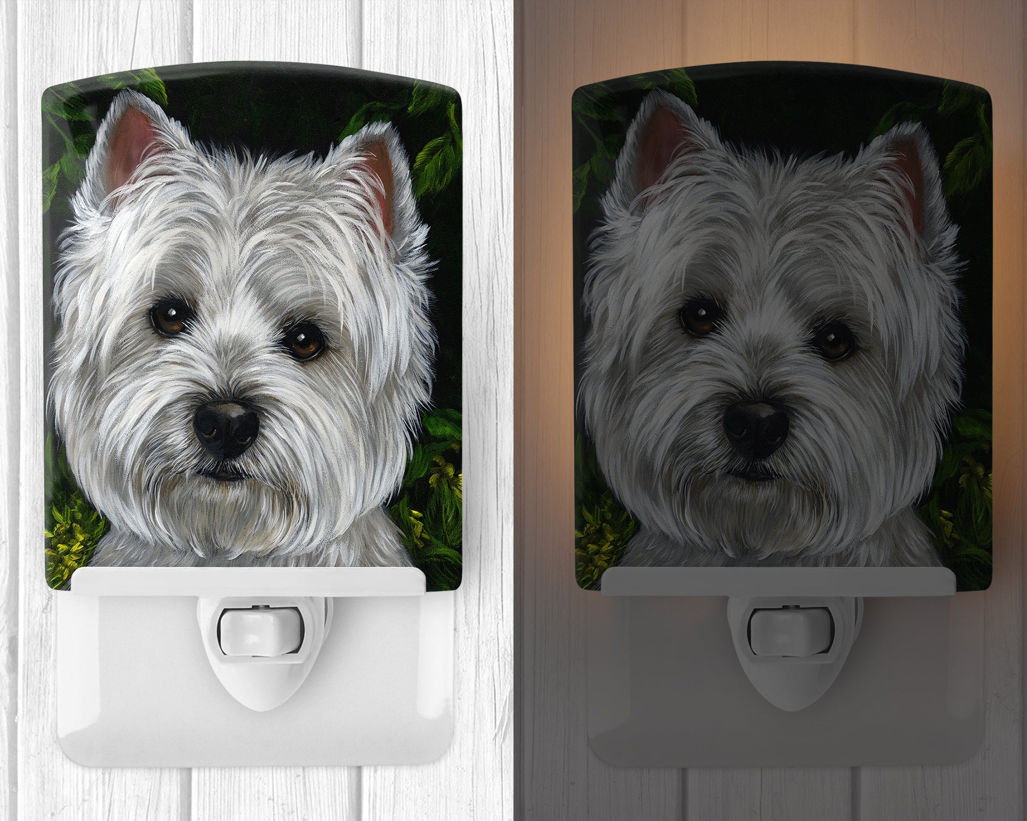 Decorate your space with our West Highland White Terrier artwork on a Night Light. Introduce a splash of artistic flair and subtle illumination to your space with the Decorative Ceramic Night Light from Caroline's Treasures. Perfect for any room, this night light seamlessly blends functionality with an aesthetic appeal, offering a stylish solution to brighten up dark corners of your home or office. Boasting a six-inch high by four-inch wide ceramic tile at the front, it showcases vivid, full-color artwork from distinguished artists, transforming a simple utility into a vibrant art piece. The artwork is securely encased in a robust metal holder, ensuring durability and longevity. Two screws are provided to firmly affix the tile into the holder. The holder extends three inches deep, housing an included bulb that emits a soft, welcoming glow. This product meets all safety standards, as evidenced by its UL approval. Proudly made in the United States from imported components, this Decorative Ceramic Night Light is not just a functional device; it's a statement piece that enhances the ambiance of your surroundings.