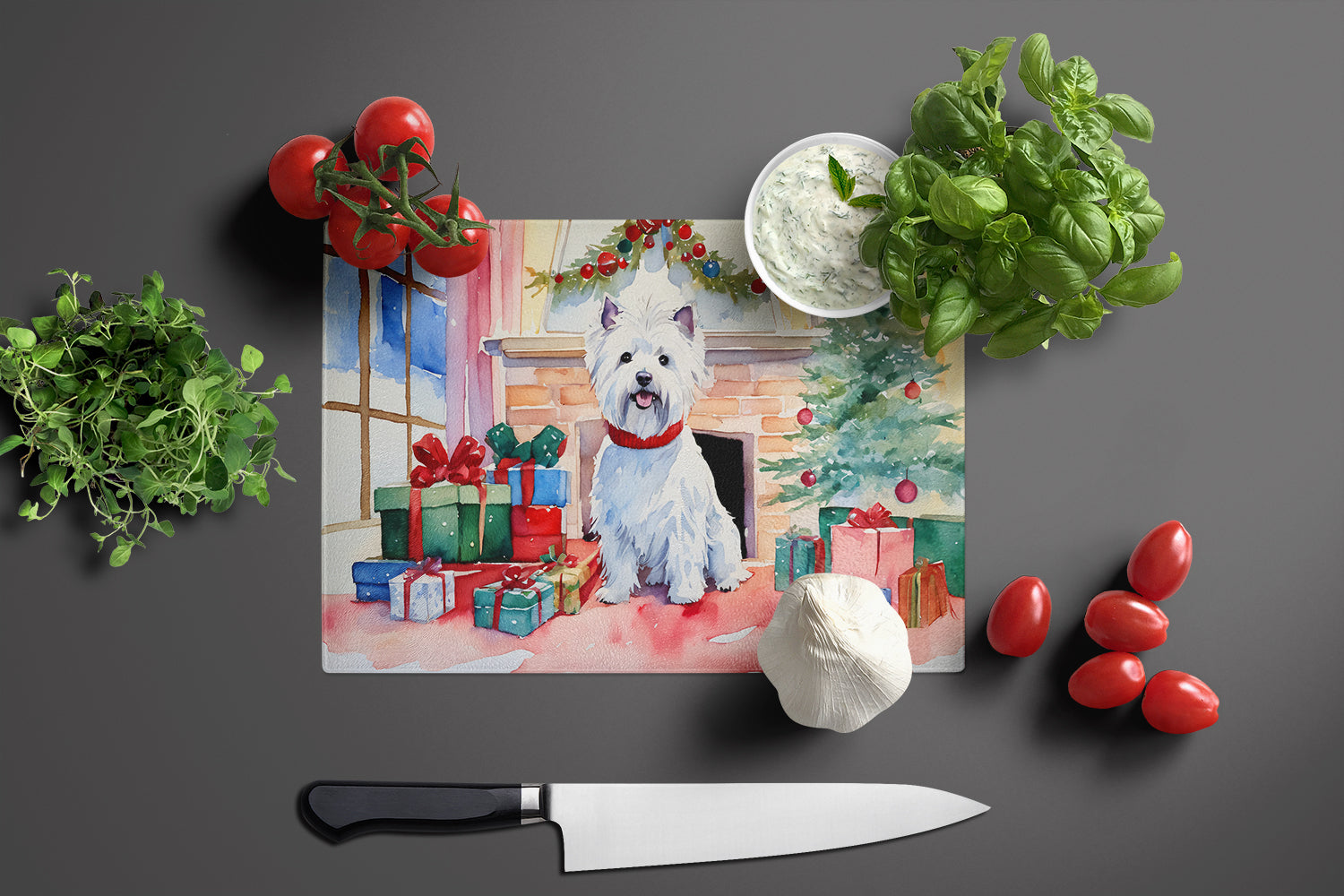 Decorate your space with our Christmas West Highland White Terrier artwork on a Cutting Board. Introduce your kitchen to the vibrant, large Decorative Glass Cutting Board from Caroline's Treasures. Crafted from resilient tempered glass, this board is not only a utilitarian necessity but also a colorful art piece. With its generous dimensions of 15 inches in height and 12 inches in length, it offers ample space for all your cutting needs. Every piece showcases captivating artwork from distinguished artists, bringing an aesthetic edge to your kitchen. Beyond its attractive design, this cutting board ensures your countertop stays pristine and unscathed, owing to its heat-resistant properties. Engineered with user convenience in mind, it features non-skid feet for stability, and rounded corners for additional safety. Its robust construction renders it virtually unbreakable, guaranteeing longevity. The board comes with protective feet bumpers, maintaining its position during use. This product is recommended to be hand washed only. Proudly printed and assembled in the United States, this cutting board exemplifies superior craftsmanship. With Caroline's Treasures' Decorative Glass Cutting Board, you're investing in a blend of functionality and artistic flair.