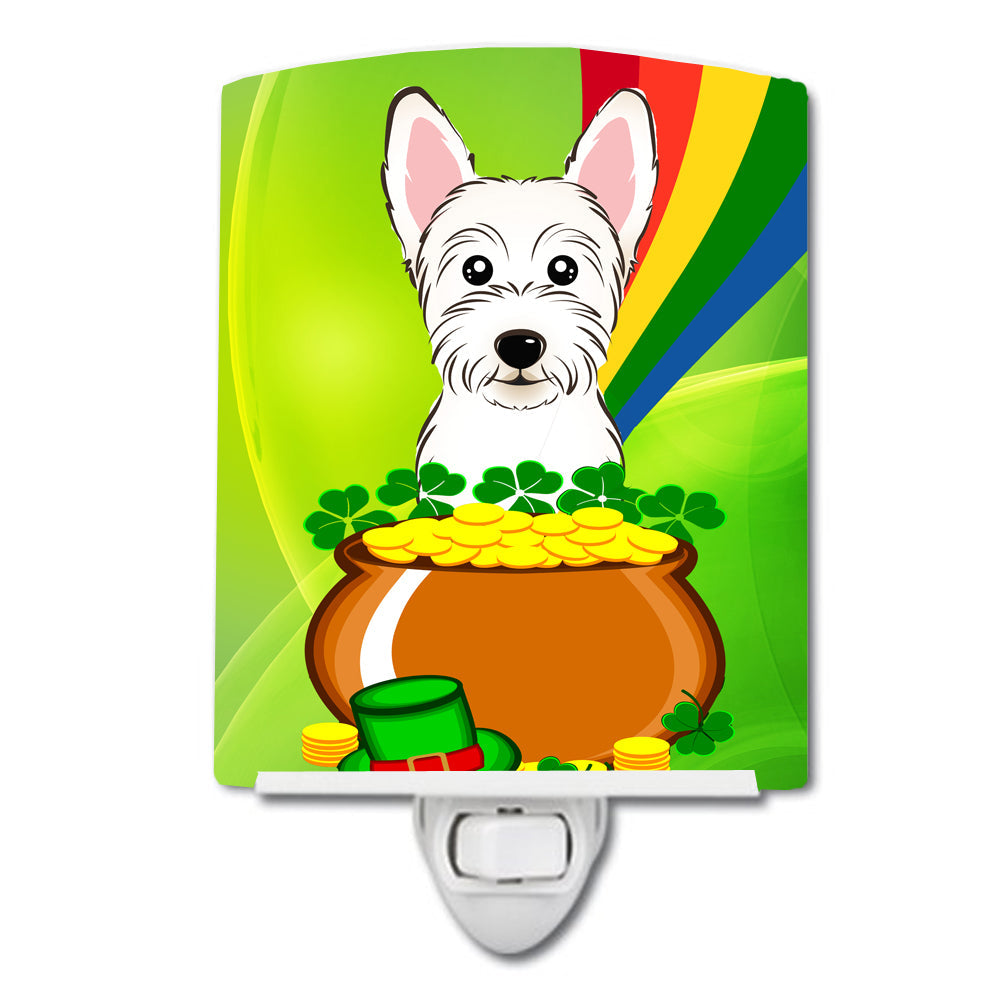 Decorate your space with our St Patrick's Day West Highland White Terrier artwork on a Night Light. Introduce a splash of artistic flair and subtle illumination to your space with the Decorative Ceramic Night Light from Caroline's Treasures. Perfect for any room, this night light seamlessly blends functionality with an aesthetic appeal, offering a stylish solution to brighten up dark corners of your home or office. Boasting a six-inch high by four-inch wide ceramic tile at the front, it showcases vivid, full-color artwork from distinguished artists, transforming a simple utility into a vibrant art piece. The artwork is securely encased in a robust metal holder, ensuring durability and longevity. Two screws are provided to firmly affix the tile into the holder. The holder extends three inches deep, housing an included bulb that emits a soft, welcoming glow. This product meets all safety standards, as evidenced by its UL approval. Proudly made in the United States from imported components, this Decorative Ceramic Night Light is not just a functional device; it's a statement piece that enhances the ambiance of your surroundings.