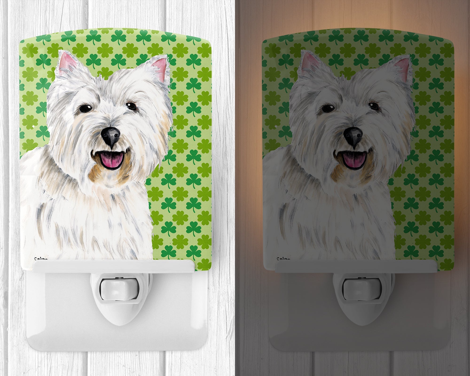 Decorate your space with our St Patrick's Day West Highland White Terrier artwork on a Night Light. Introduce a splash of artistic flair and subtle illumination to your space with the Decorative Ceramic Night Light from Caroline's Treasures. Perfect for any room, this night light seamlessly blends functionality with an aesthetic appeal, offering a stylish solution to brighten up dark corners of your home or office. Boasting a six-inch high by four-inch wide ceramic tile at the front, it showcases vivid, full-color artwork from distinguished artists, transforming a simple utility into a vibrant art piece. The artwork is securely encased in a robust metal holder, ensuring durability and longevity. Two screws are provided to firmly affix the tile into the holder. The holder extends three inches deep, housing an included bulb that emits a soft, welcoming glow. This product meets all safety standards, as evidenced by its UL approval. Proudly made in the United States from imported components, this Decorative Ceramic Night Light is not just a functional device; it's a statement piece that enhances the ambiance of your surroundings.