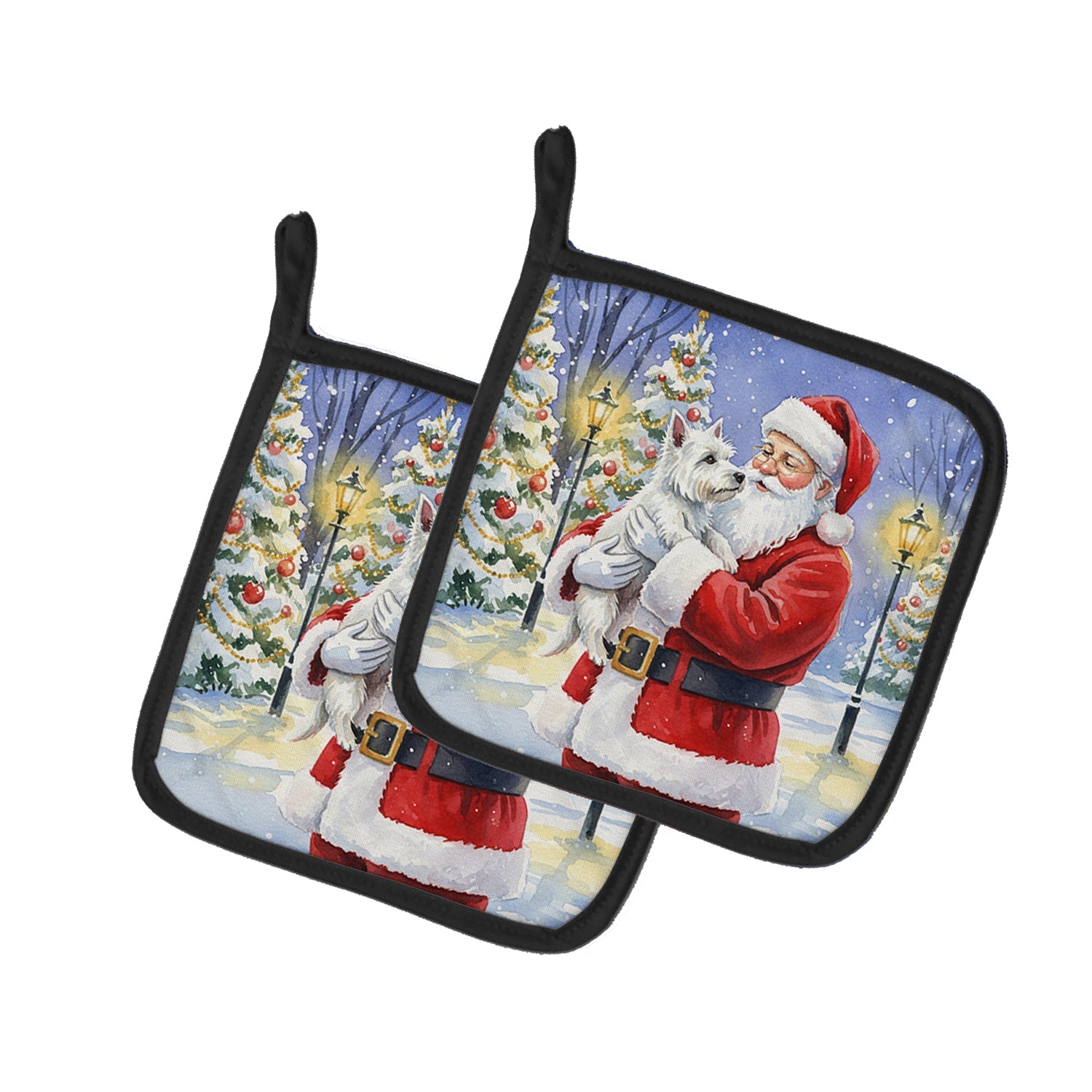 Pair of Pot Holders featuring breed specific West Highland White Terrier artwork. Celebrate Christmas with this Christmas Pair of Pot Holders. Add warmth, personality, and function to your kitchen with our Vegetables Pot Holder Pair. Each set includes two quilted hot pads, featuring original full-color watercolor artwork on a soft polyester front accented by black trim. Crafted with multiple layers for performance: Top Layer: Vibrant artwork permanently dyed into polyester fabric. Middle Layer: US-manufactured insulated material with breathable polyester fibers and a reflective metalized film that reflects heat back to its source. Bottom Layer: A silver heat-resistant backing for extra protection. Each pot holder measures 7.5" x 7.5", includes a hanging tab, and is quilted for durability. Use them to protect your hands, countertops, and tabletops — or as decorative trivets for Thanksgiving, Christmas, or everyday meals.