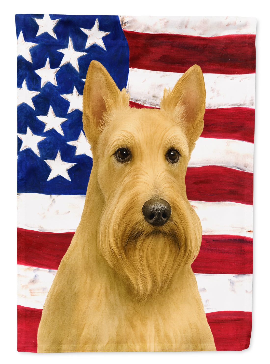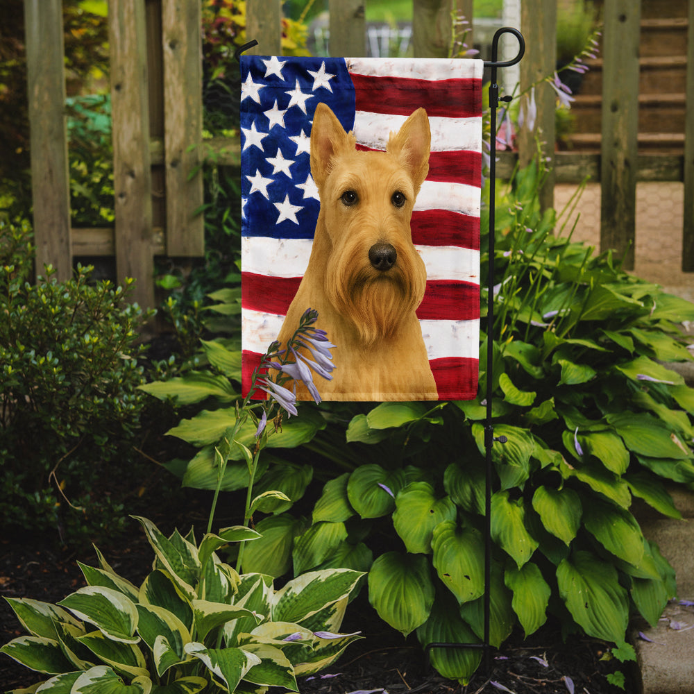 Garden Flag featuring breed specific Scottish Terrier artwork. Enhance the beauty of your garden, patio, or yard with Caroline's Treasures Decorative Garden Flag, proudly made in the USA. Crafted from two pieces of thick, double-sided polyester fabric, this 2-ply garden flag is designed to withstand various weather conditions, making it water-resistant and weatherproof. Featuring correctly readable words on both sides, this garden flag offers a delightful visual experience from any angle. With its heavier weight, it stands out among other garden flags, ensuring stability and durability even in wind, rain, and snow. Measuring approximately 11 1/4 inches by 15 1/2 inches, this flag allows you to personalize your outdoor decor. It comes with a 1 1/2-inch sleeve sewn in, allowing easy attachment to any standard garden flag stand or garden size porch hanger (sold separately). Make a statement in your outdoor space with Caroline's Treasures Decorative Garden Flag, a vibrant and high-quality flag that adds color and personality to your surroundings. Proudly made in the USA, it's a symbol of quality craftsmanship and attention to detail.