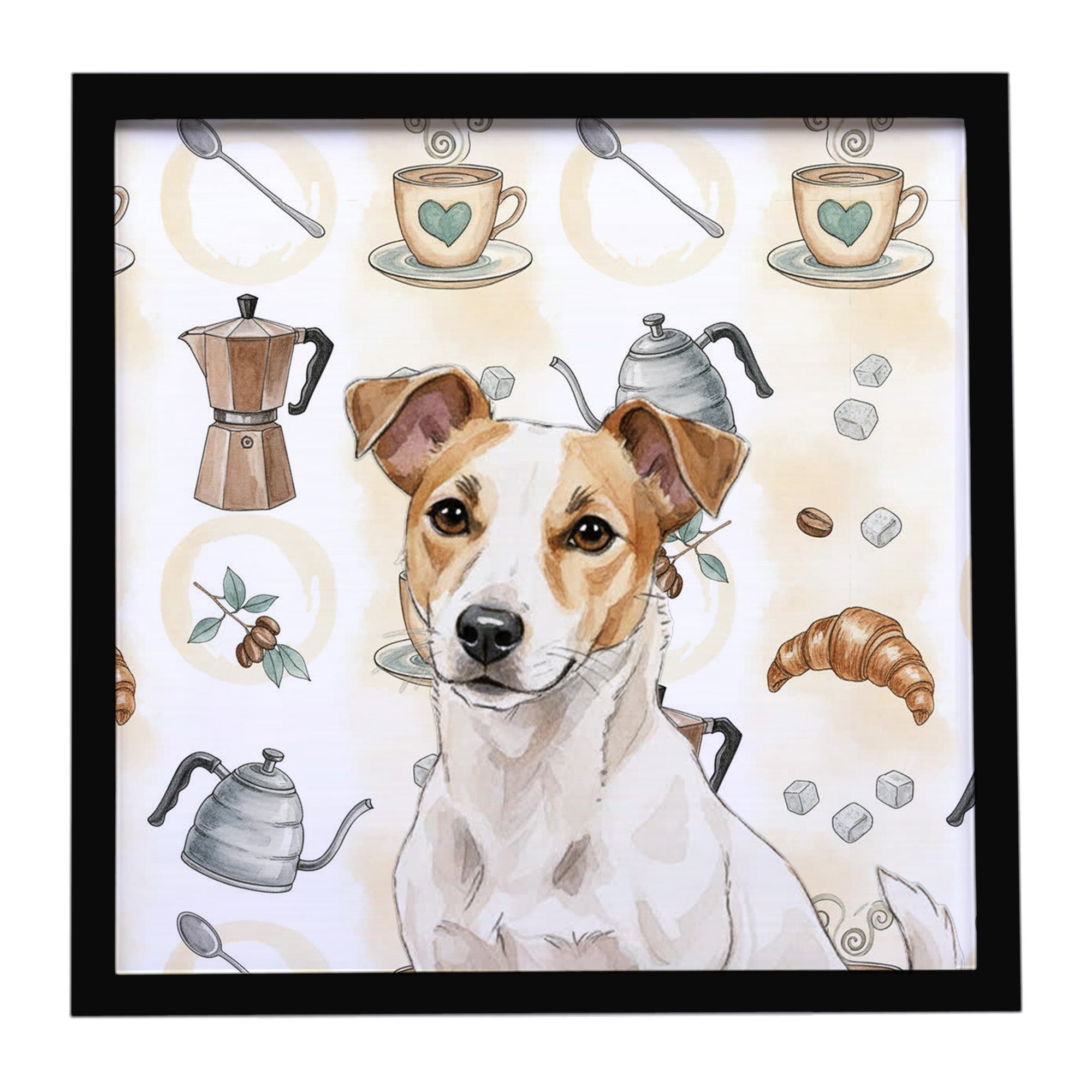 Framed Metal Print featuring breed specific Jack Russell Terrier artwork. Looking for wall art that’s stylish, safe, and made to last? Our 8x8 Framed Metal Prints are designed with modern living in mind. Each piece features original artwork printed on durable aluminum, set in a sleek frame that measures 3/4 inch deep for a clean, contemporary finish. Unlike glass prints, these are lightweight, shatter-free, and family-safe. Perfect for kitchens, bathrooms, or covered porches where traditional décor might not hold up. The built-in sawtooth hanger molded into the back makes it easy to hang right out of the box—just use your own nails or screws. Cleaning is simple too: a quick wipe with a damp cloth and mild soap keeps your artwork looking vibrant. Proudly made in Alabama, every print supports our community of artists while adding personality and charm to your home.