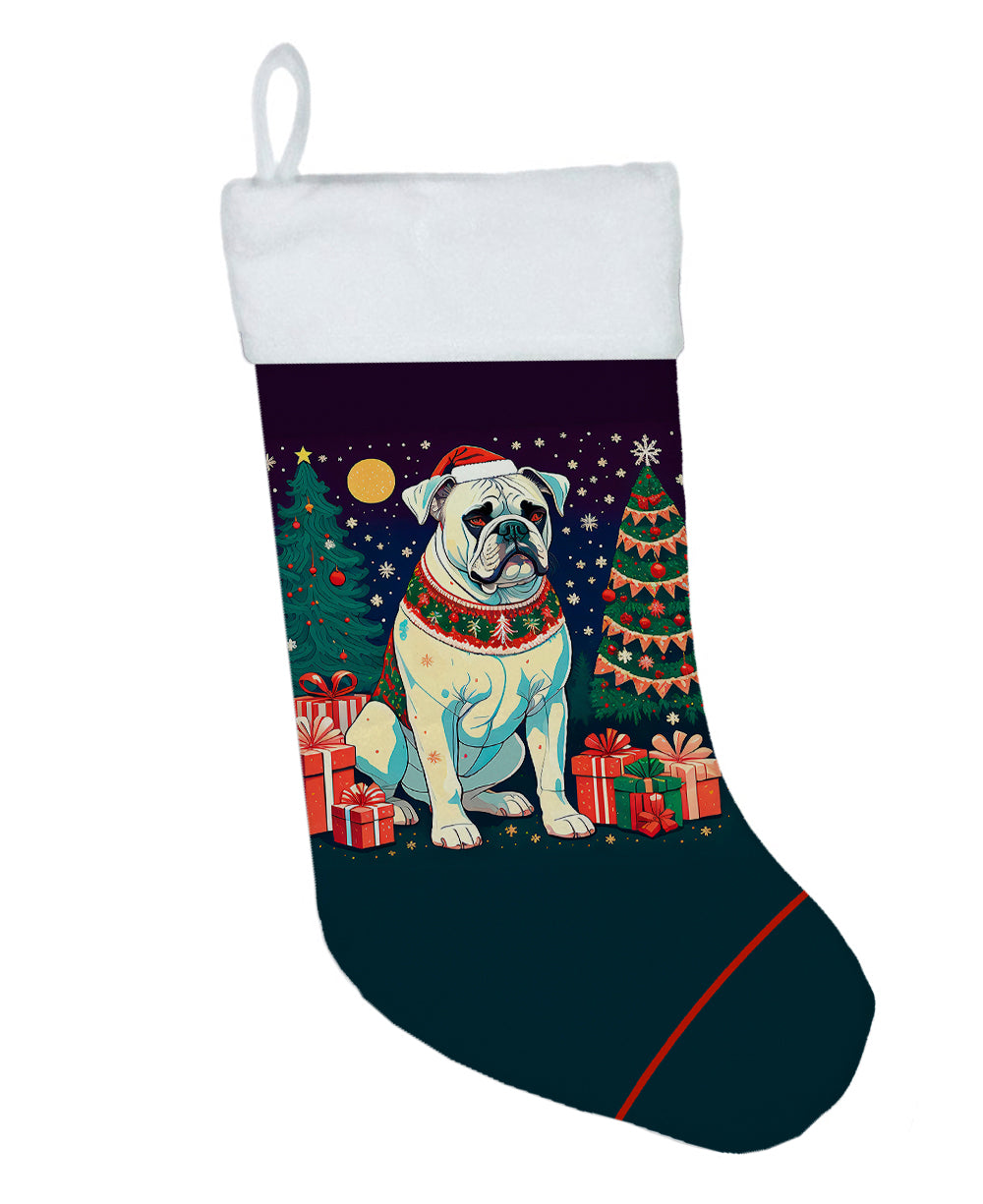 Decorate your space with our Christmas Boxer artwork on a Stocking. Bring the warmth of the festive season into your home with our luxurious Christmas Stocking. Designed to impress, this beautiful stocking is crafted from 100% polyester suede, delivering both superior softness and long-lasting durability. Measuring approximately 18 inches in height and 11 inches in width, it boasts generous space for a delightful assortment of Santa's gifts. What sets our Christmas Stocking apart is the exquisite design that is printed on both sides. Whether you hang it on the mantel or from a stocking hanger, the charming holiday print remains visible, adding a festive spirit to your décor from any direction. The stocking features a robust hanging tab that's crafted from the same suede fabric, guaranteeing secure hanging during the holiday excitement. An added bonus? This Christmas Stocking is completely machine washable. After the season's festivities, simply wash it, lay flat or hang to dry, and it's ready for the next holiday season. Proudly designed, printed and sewn in the United States, our stocking makes a stylish addition to your Christmas décor or a thoughtful gift for loved ones. Cherish the spirit of Christmas with our beautifully crafted, double-sided, easy-care stocking.