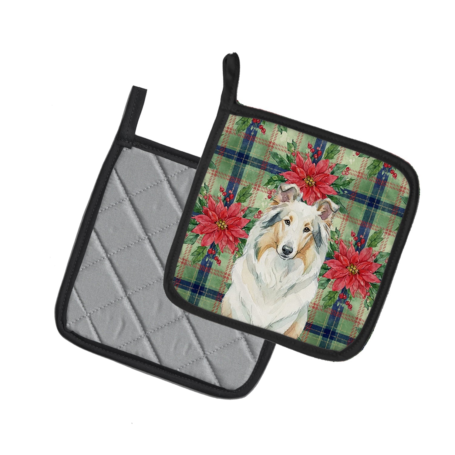 Pair of Pot Holders featuring breed specific Collie artwork. Celebrate Christmas with this Christmas Pair of Pot Holders. Add warmth, personality, and function to your kitchen with our Christmas Poinsettas Pot Holder Pair. Each set includes two quilted hot pads, featuring original full-color watercolor artwork on a soft polyester front accented by black trim. Crafted with multiple layers for performance: Top Layer: Vibrant artwork permanently dyed into polyester fabric. Middle Layer: US-manufactured insulated material with breathable polyester fibers and a reflective metalized film that reflects heat back to its source. Bottom Layer: A silver heat-resistant backing for extra protection. Each pot holder measures 7.5" x 7.5", includes a hanging tab, and is quilted for durability. Use them to protect your hands, countertops, and tabletops — or as decorative trivets for Thanksgiving, Christmas, or everyday meals.