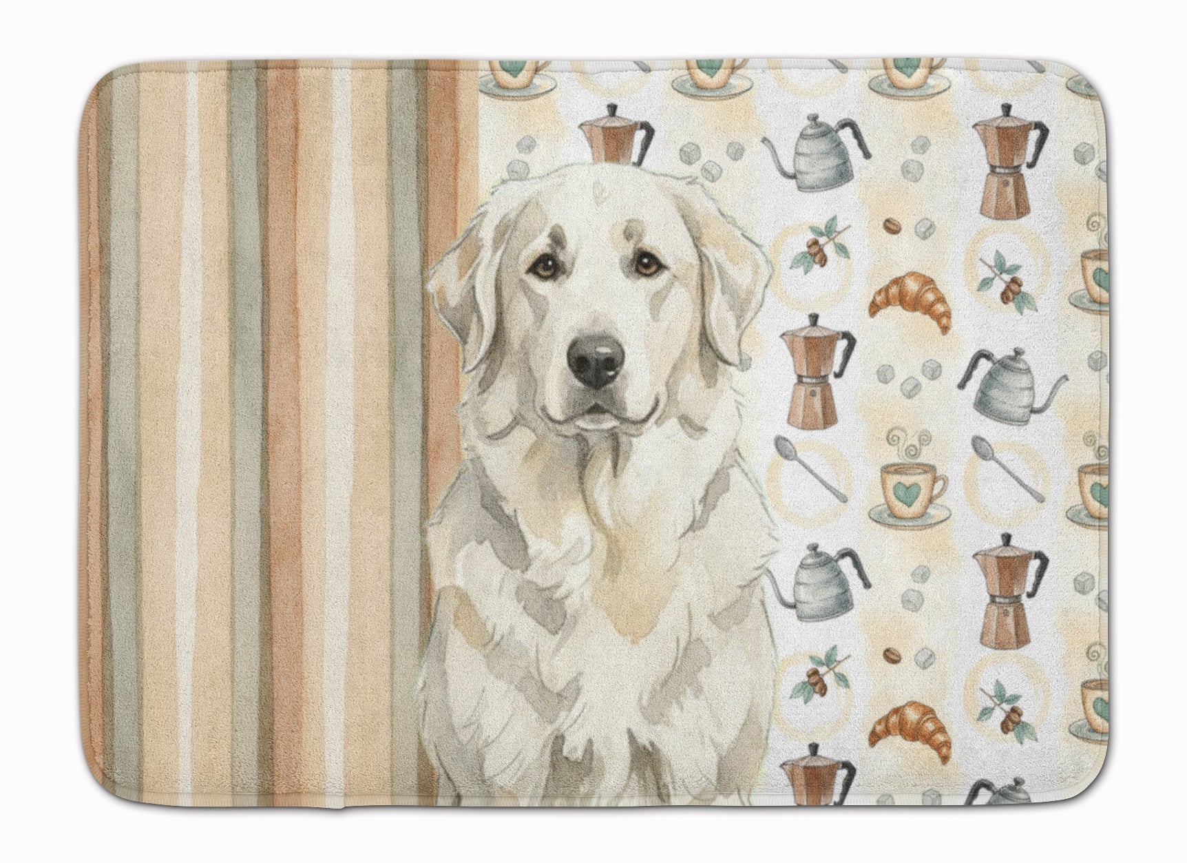 Shown here is the White Great Pyrenees Coffee Bar Memory Foam Kitchen Mat from Caroline's Treasures featuring artwork of a Great Pyrenees in a Everyday design. The detailed illustration and vibrant colors make it a standout accent that celebrates both seasonal style and love for the subject. This image features a cozy watercolor coffee-themed pattern with illustrated mugs, moka pots, kettles, croissants, coffee beans, and sugar cubes arranged in a repeating design. Soft neutral tones with warm browns, creams, and subtle sage accents create an inviting, café-inspired look that feels comforting and relaxed. Everyday décor celebrates personal style and the small moments that make a house feel like home. Thoughtful designs add warmth and personality that can be enjoyed year-round. Transform your floor into a work of art with Caroline's Treasures' Memory Foam Mat. This mat offers not only a stunning visual appeal but also a luxurious, plush feel that's incredibly comfortable to the touch. It's a versatile, machine-washable mat designed for both bath and kitchen use, ensuring you experience the best in comfort and convenience. Care Instructions: Maintaining this memory foam mat is a breeze. Simply follow the care instructions on the product tag. It's recommended to wash in cold water and dry on a low-temperature setting in the dryer. This ensures the mat retains its quality and longevity, allowing you to enjoy its beauty and comfort for a long time. Caroline's Treasures' Memory Foam Mat Machine Washable is the perfect blend of artistry, comfort, and practicality, making it a standout addition to any space. Upgrade your home decor with this versatile and stylish mat today. Great Pyrenees dogs are large guardian breeds known for their calm confidence and protective instincts. This mountain breed is admired for its loyalty, patience, and steady vigilance. Makes a heartfelt gift for: Great Pyrenees owners, Dogs lovers, Everyday gifts, pet parents, friends who adore their Great Pyrenees, or anyone celebrating Dogs.