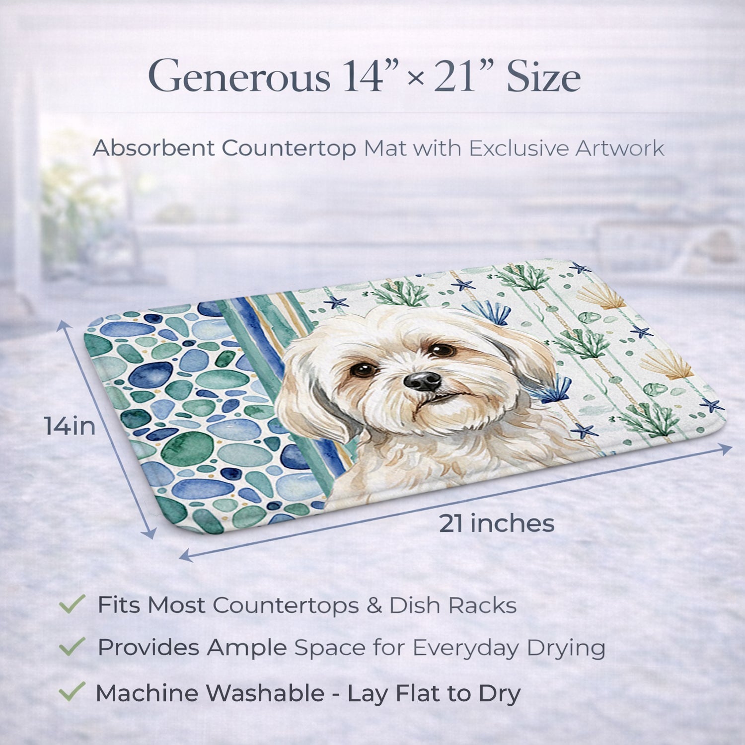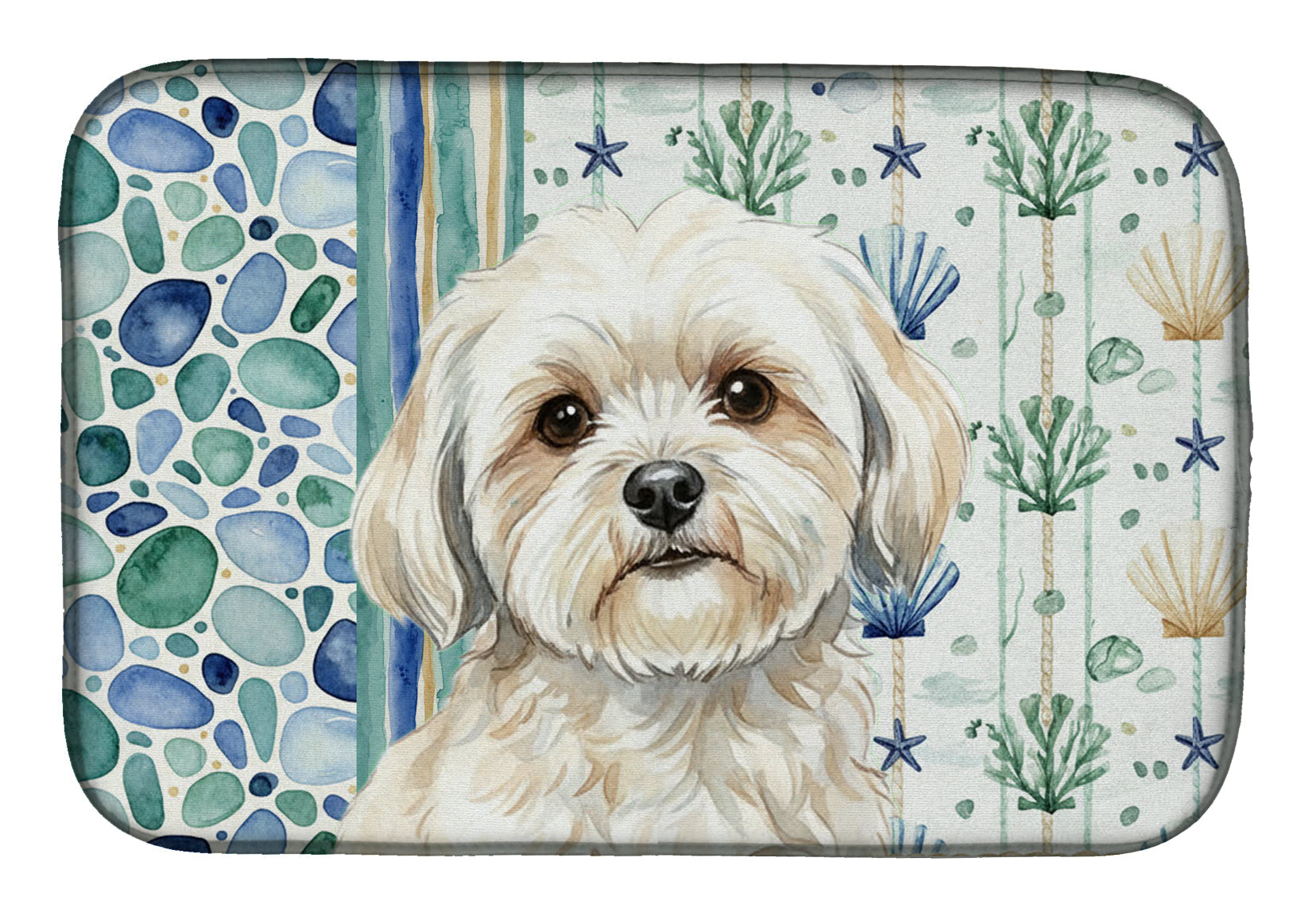 Shown here is the White Lhasa Apso Coastal Sea Glass Dish Drying Mat from Caroline's Treasures featuring artwork of a Lhasa Apso in a Everyday design. The detailed illustration and vibrant colors make it a standout accent that celebrates both seasonal style and love for the subject. This image features a calming coastal watercolor pattern with soft seashells, seaweed, starfish, and pebble-inspired accents arranged in a repeating design. The soothing palette of blues, greens, and sandy neutrals creates a relaxed, beach-inspired look that adds a fresh and tranquil feel to any space. Everyday décor celebrates personal style and the small moments that make a house feel like home. Thoughtful designs add warmth and personality that can be enjoyed year-round. Say goodbye to messy countertops and soggy dish towels with our innovative dish drying mat. Our high-quality dish drying pad is designed to keep your countertops dry while offering a stylish and efficient solution. Whether you're air drying dishes, glasses, stemware, silverware, pots, pans, bottles, or even fruits and vegetables, our dish mat is the perfect choice. The 14 inches x 21 inches size fits most counters and dish drying racks, and the non-slip design ensures stability. Made with water-absorbent polyester and a polyurethane foam insert, our dish drying mat is not only functional but also durable. It's machine washable and printed in the USA for long-lasting use. The beautiful artwork adds flair to your kitchen decor, making it a perfect housewarming gift or present for any occasion. Upgrade your kitchen experience with our absorbent and versatile dish drying mat. Perfect for: Kitchen counters and sinks, everyday dish drying and countertop protection, Dogs-themed homes, or year-round use for Lhasa Apso lovers. Lhasa Apsos are small companion dogs known for their independence and alert nature. This ancient breed is valued for its loyalty, confidence, and strong attachment to its owners. Makes a heartfelt gift for: Lhasa Apso owners, Dogs lovers, Everyday gifts, pet parents, friends who adore their Lhasa Apso, or anyone celebrating Dogs.
