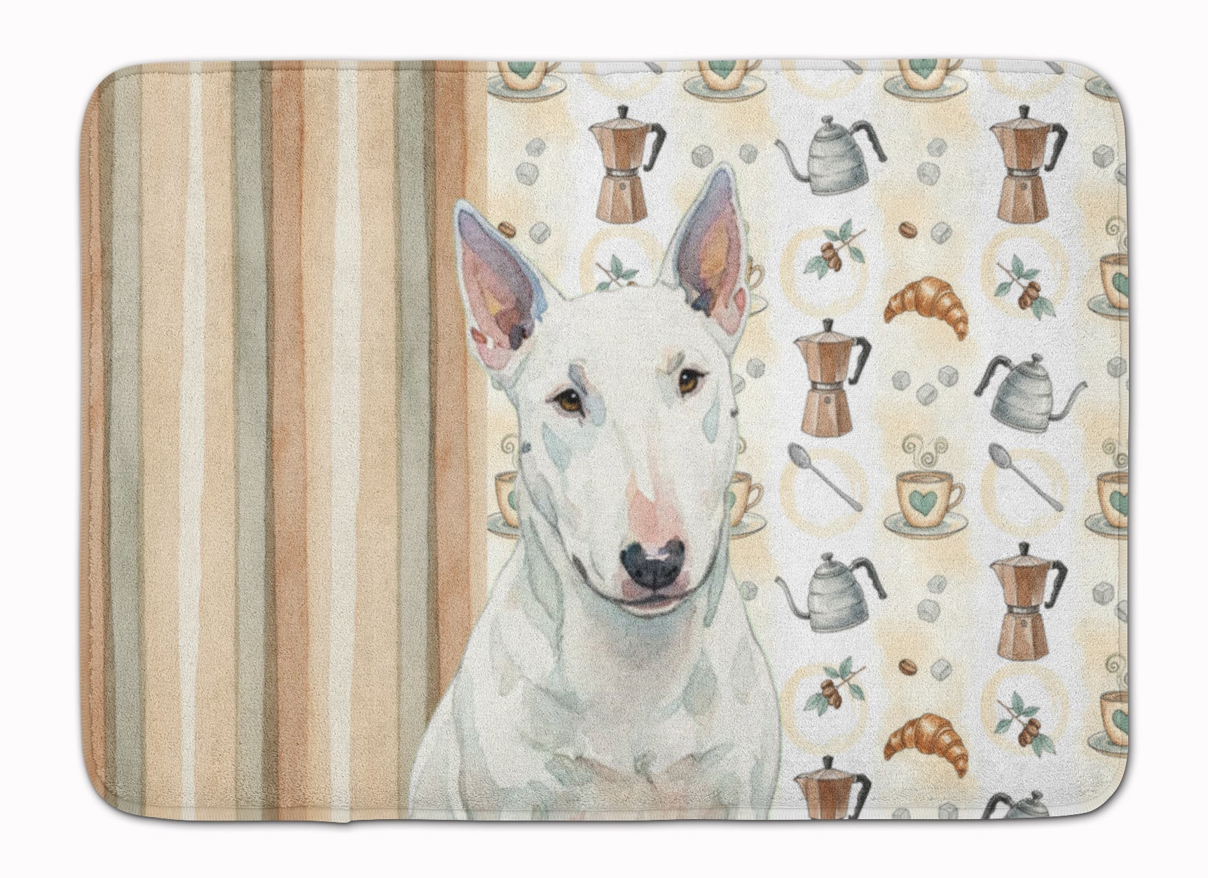 Shown here is the White Miniature Bull Terrier Coffee Bar Memory Foam Kitchen Mat from Caroline's Treasures featuring artwork of a Miniature Bull Terrier in a Everyday design. The detailed illustration and vibrant colors make it a standout accent that celebrates both seasonal style and love for the subject. This image features a cozy watercolor coffee-themed pattern with illustrated mugs, moka pots, kettles, croissants, coffee beans, and sugar cubes arranged in a repeating design. Soft neutral tones with warm browns, creams, and subtle sage accents create an inviting, café-inspired look that feels comforting and relaxed. Everyday décor celebrates personal style and the small moments that make a house feel like home. Thoughtful designs add warmth and personality that can be enjoyed year-round. Transform your floor into a work of art with Caroline's Treasures' Memory Foam Mat. This mat offers not only a stunning visual appeal but also a luxurious, plush feel that's incredibly comfortable to the touch. It's a versatile, machine-washable mat designed for both bath and kitchen use, ensuring you experience the best in comfort and convenience. Care Instructions: Maintaining this memory foam mat is a breeze. Simply follow the care instructions on the product tag. It's recommended to wash in cold water and dry on a low-temperature setting in the dryer. This ensures the mat retains its quality and longevity, allowing you to enjoy its beauty and comfort for a long time. Caroline's Treasures' Memory Foam Mat Machine Washable is the perfect blend of artistry, comfort, and practicality, making it a standout addition to any space. Upgrade your home decor with this versatile and stylish mat today. Miniature Bull Terriers feature muscular builds and distinctive head shapes. Their appearance feels bold and confident. Makes a heartfelt gift for: Miniature Bull Terrier owners, Dogs lovers, Everyday gifts, pet parents, friends who adore their Miniature Bull Terrier, or anyone celebrating Dogs.