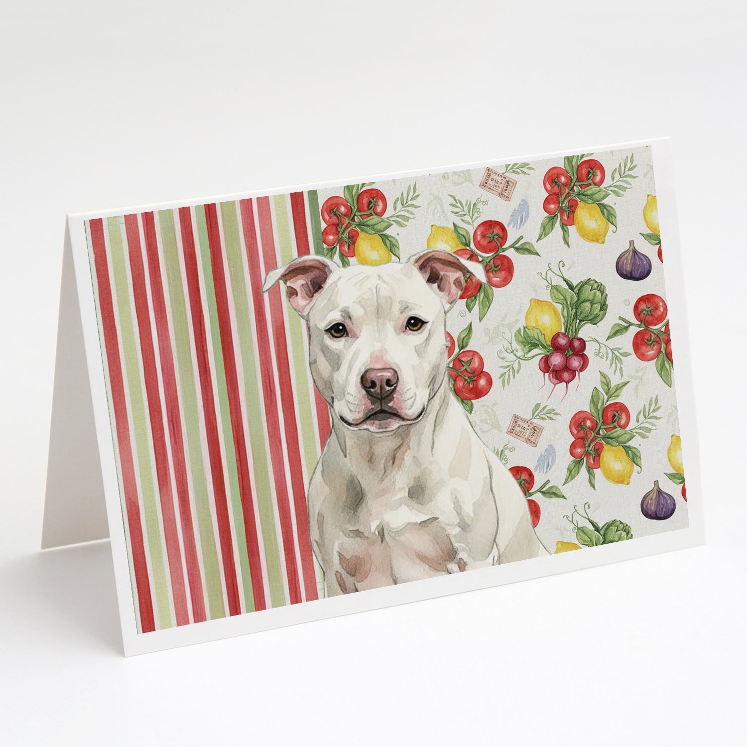 Shown here is the White Staffordshire Bull Terrier Vegetables Greeting Cards Pack of 8 from Caroline's Treasures featuring artwork of a Staffordshire Bull Terrier in a Everyday design. The detailed illustration and vibrant colors make it a standout accent that celebrates both seasonal style and love for the subject. This image features a vibrant watercolor vegetable pattern with tomatoes, lemons, artichokes, figs, radishes, and leafy greens arranged in a repeating design, paired with classic red and green stripes. The bright, garden-fresh palette creates a cheerful, farmhouse-inspired look that feels lively, welcoming, and perfect for kitchen décor. Everyday décor celebrates personal style and the small moments that make a house feel like home. Thoughtful designs add warmth and personality that can be enjoyed year-round. Celebrate special moments with Caroline's Treasures Printed Greeting Card Pack. This pack includes eight beautifully folded 5x7 cards, accompanied by eight matching white envelopes. With blank interiors, these cards provide ample space for your personalized messages and heartfelt holiday greetings. Each card features captivating full-color artwork, meticulously printed in our facility on high-quality 80 lb cover stock or 216 GSM. The super smooth finish of the white cards enhances the visual impact of the artwork, creating a truly stunning presentation. Designed by our talented in-house artists or licensed artists, the artwork on these cards showcases their creativity and attention to detail. From vibrant illustrations to captivating designs, each card tells its own unique story. Whether it's for birthdays, anniversaries, holidays, or any special occasion, Caroline's Treasures Greeting Card Pack is the perfect way to convey your heartfelt sentiments. Share joy, love, and warm wishes with these exquisite cards and make every moment unforgettable. Perfect for: Writing personal messages, everyday correspondence, and thoughtful notes, Dogs-themed stationery collections, or year-round use for Staffordshire Bull Terrier lovers. Staffordshire Bull Terriers are strong dogs known for their affectionate nature and courage. This breed is admired for its loyalty, confidence, and devotion to family. Makes a heartfelt gift for: Staffordshire Bull Terrier owners, Dogs lovers, Everyday gifts, pet parents, friends who adore their Staffordshire Bull Terrier, or anyone celebrating Dogs.