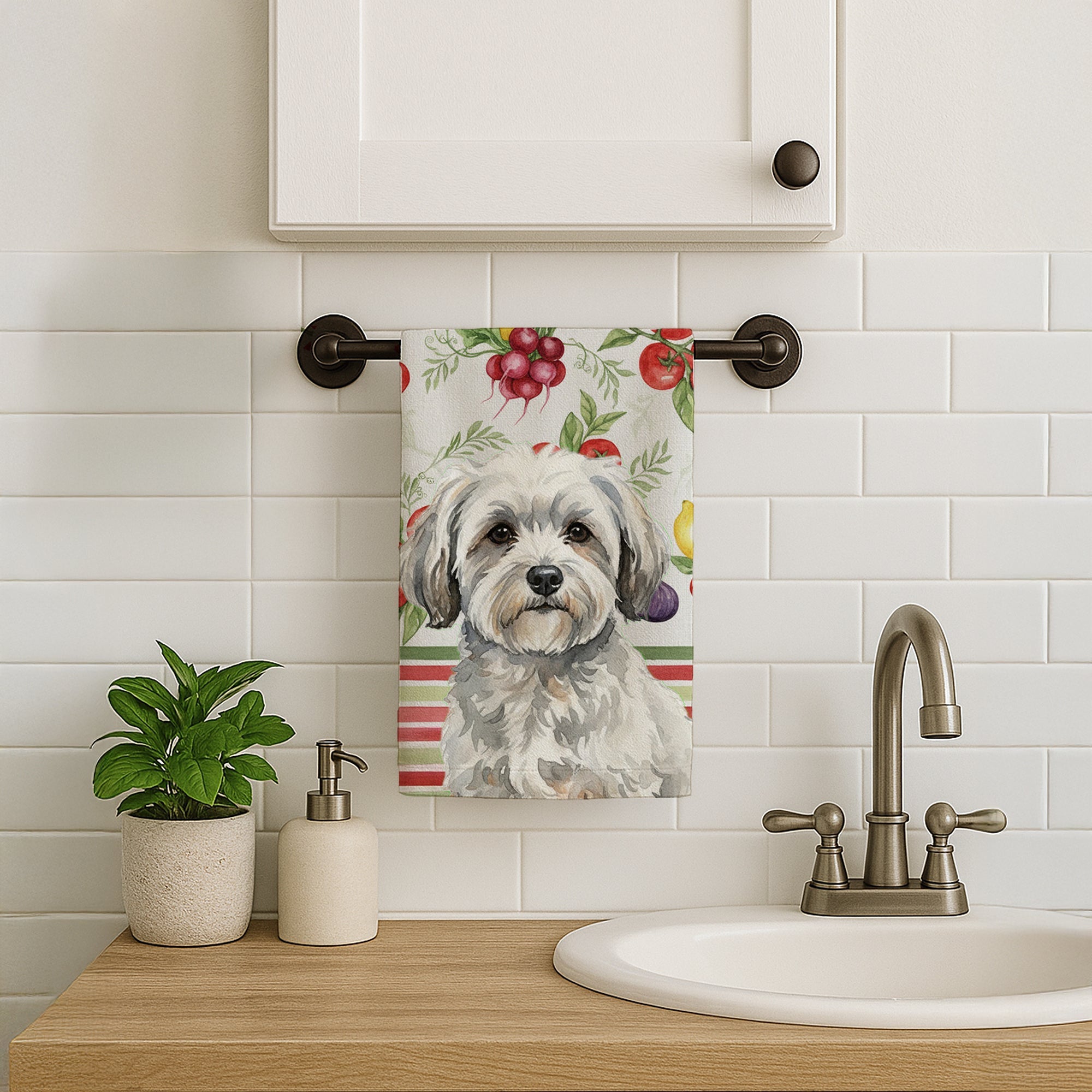 Kitchen Towel featuring breed specific Coton de Tulear artwork. Bring cozy everyday charm to your sink or powder room with a plush velour towel featuring original watercolor artwork. The front is a soft, color-rich minky polyester that polishes glassware to a brilliant shine; the back is 100% white cotton terry loop for quick absorbency on hands, dishes, and counters. Artwork is dyed into the fibers for lasting color that won’t crack or peel. Finished edges keep the shape wash after wash. Size: 15" x 25". Machine wash; tumble dry low. Designed and printed in the USA.