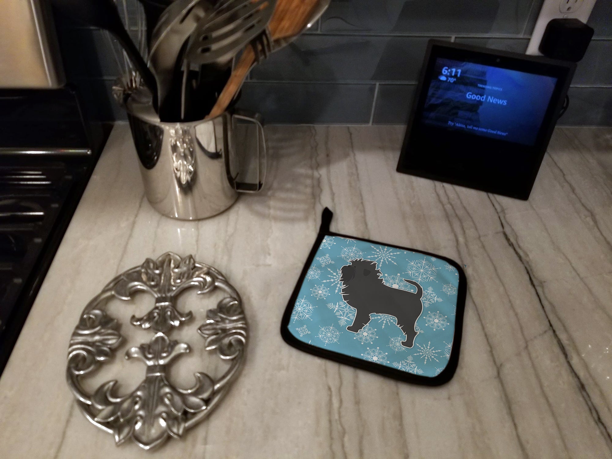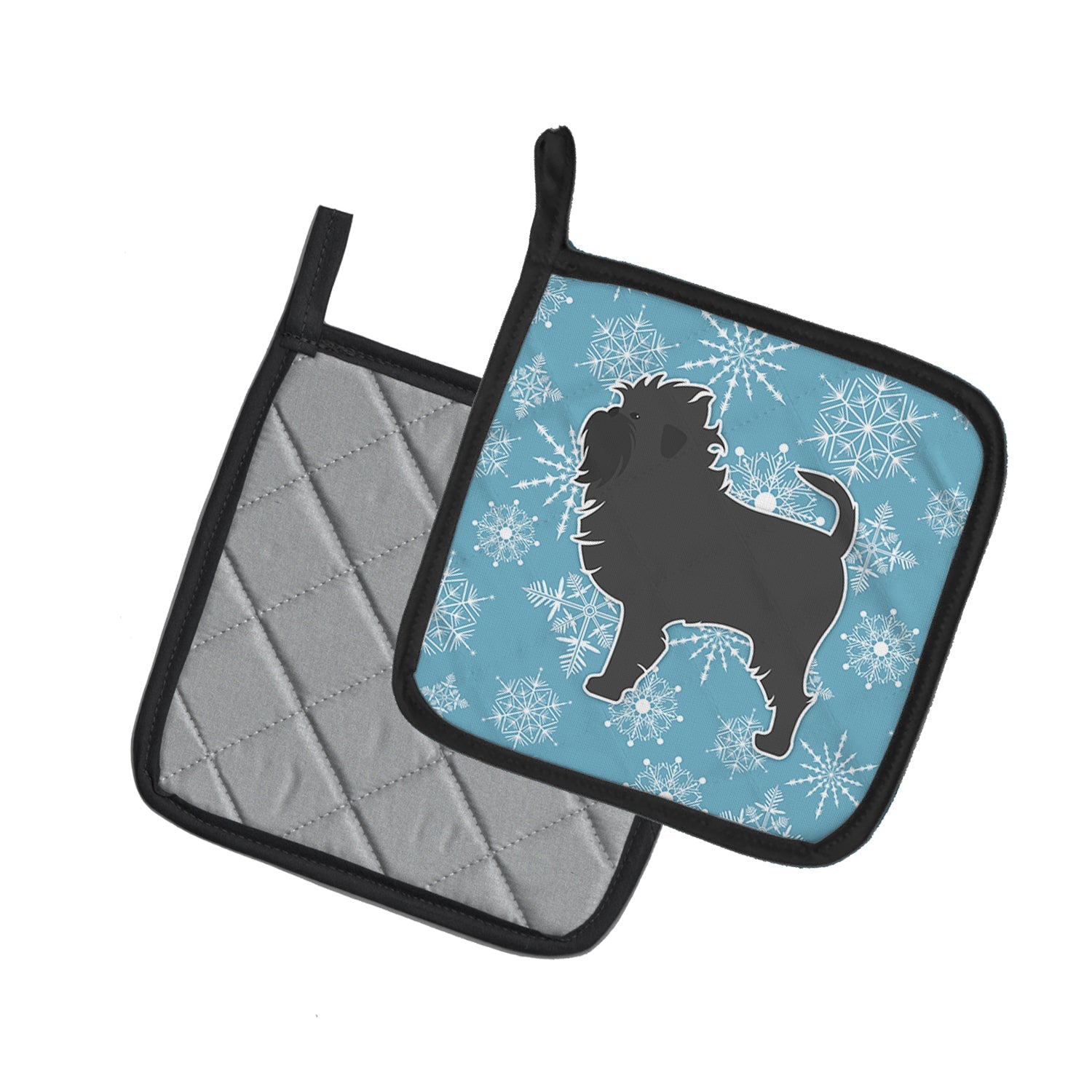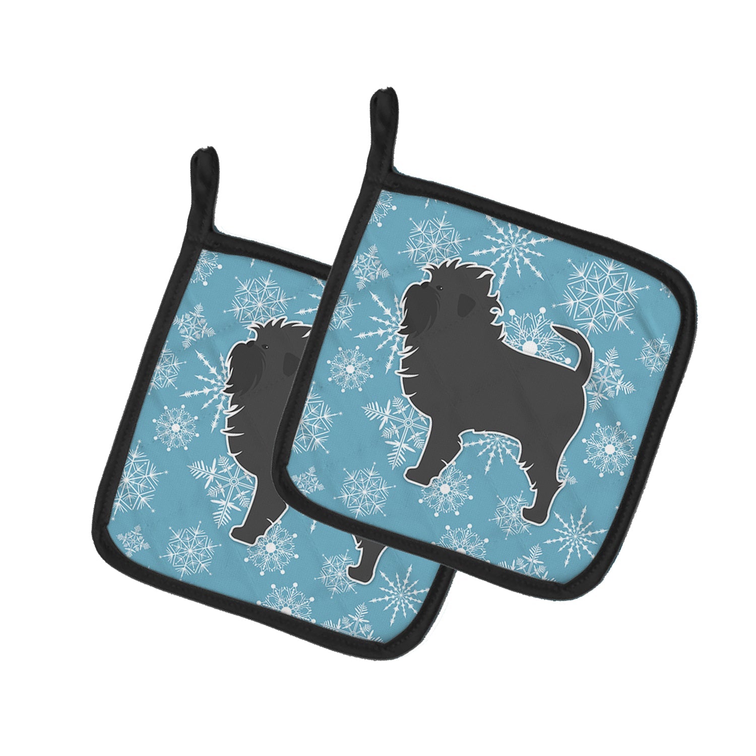 Decorate your space with our Christmas Affenpinscher artwork on a Pair of Pot Holders. Bring a bit of Winter into your home with a Winter Pair of Pot Holders. A Pair of Pot Holders to match your kitchen decor. Made in the USA these are thick and functional. Full color artwork decorates the front polyester fabric of the hot pad and accented by a black trim. Use these at as a trivet for your Thanksgiving or Christmas tablescape. Filled with insulated fabric and quilted for durability. These colorful pot holders will make a great gift for your favorite home cook or executive chef. Each pot holder measures approximately 7 1/2 inches by 7 1/2 inches. A hanging tab is included.