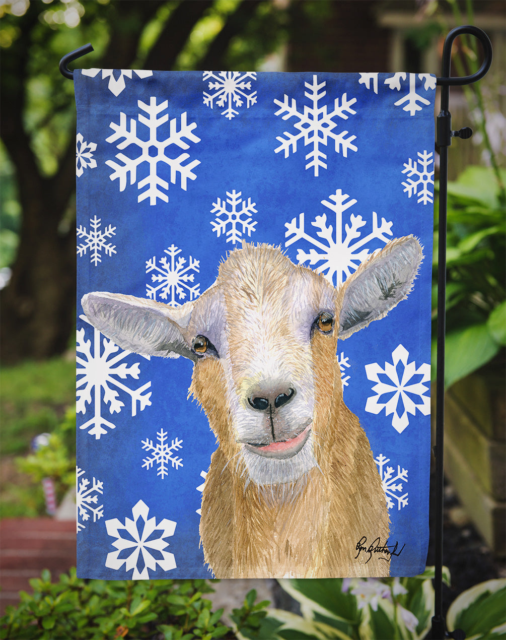 Decorate your space with our Christmas Goat artwork on a Garden Flag. Bring a bit of Winter into your home with a Winter Garden Flag. Enhance the beauty of your garden, patio, or yard with Caroline's Treasures Decorative Garden Flag, proudly made in the USA. Crafted from two pieces of thick, double-sided polyester fabric, this 2-ply garden flag is designed to withstand various weather conditions, making it water-resistant and weatherproof. Featuring correctly readable words on both sides, this garden flag offers a delightful visual experience from any angle. With its heavier weight, it stands out among other garden flags, ensuring stability and durability even in wind, rain, and snow. Measuring approximately 11 1/4 inches by 15 1/2 inches, this flag allows you to personalize your outdoor decor. It comes with a 1 1/2-inch sleeve sewn in, allowing easy attachment to any standard garden flag stand or garden size porch hanger (sold separately). Make a statement in your outdoor space with Caroline's Treasures Decorative Garden Flag, a vibrant and high-quality flag that adds color and personality to your surroundings. Proudly made in the USA, it's a symbol of quality craftsmanship and attention to detail.