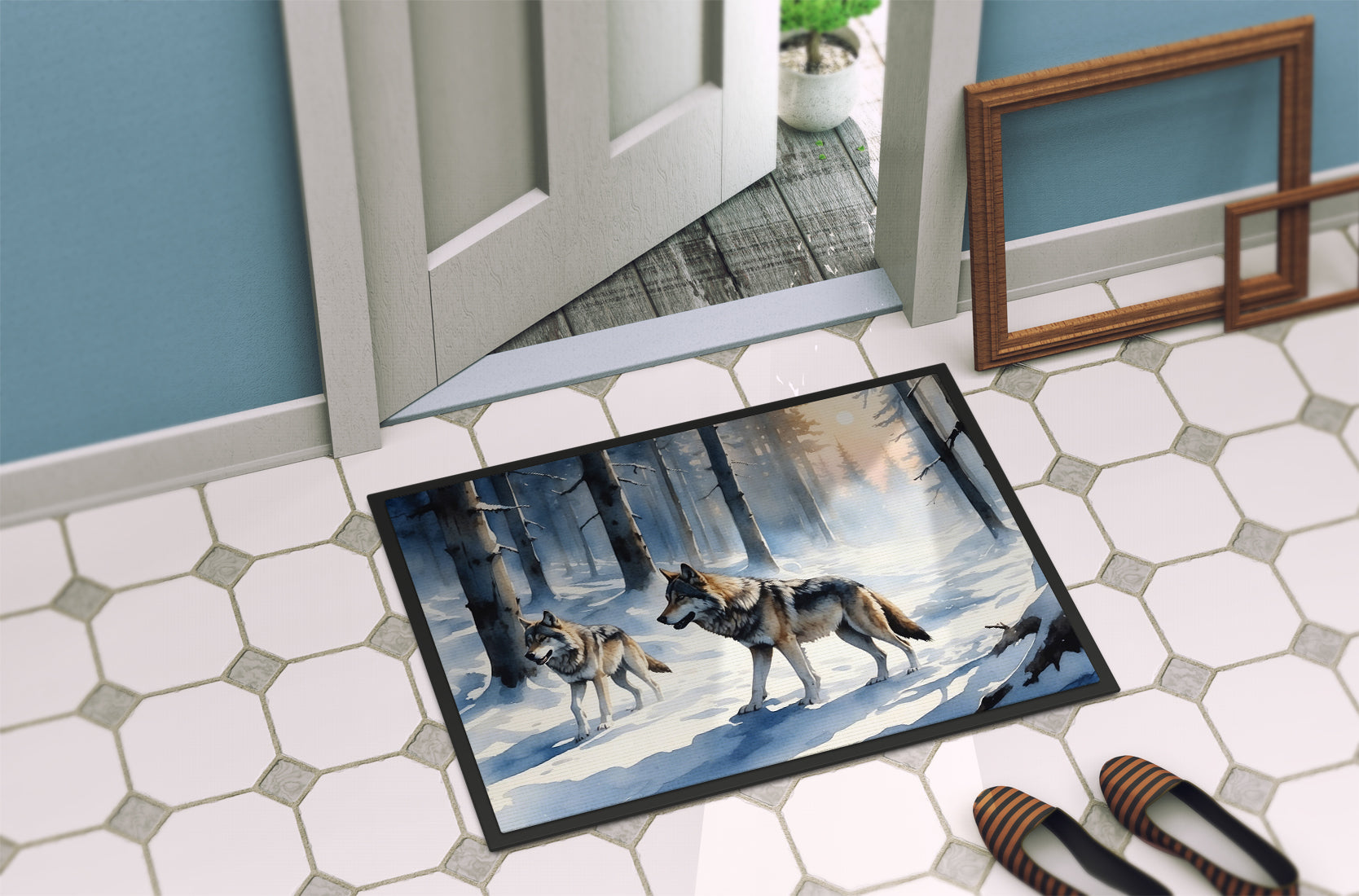 Doormat featuring breed specific Wolf artwork. Welcome your guests in style with our Artwork Door Mat, designed to withstand almost any weather condition. This mat, measuring approximately 24 by 36 inches, is held together by durable black binding tape. Its top layer, composed of polyester felt, is dyed with the eye-catching image you see on the mat. A few layers below provide the mat with stability, while its rubber bottom is stamped to help prevent slipping and ensures safety. Our mat works wonderfully as both an indoor or outdoor door mat. For cleaning, simply hose it off with water or use a power washer - no need for any cleaner that produces suds. Avoid scrubbing with a brush, instead, opt for the vacuum on floor setting. Designed manufactured and printed in the USA, this mat is a perfect addition to your porch, outdoor kitchen, entryway, or any indoor space. Its unique design makes it a charming decorative rug that greets your guests and adds a stylish touch to your home decor.