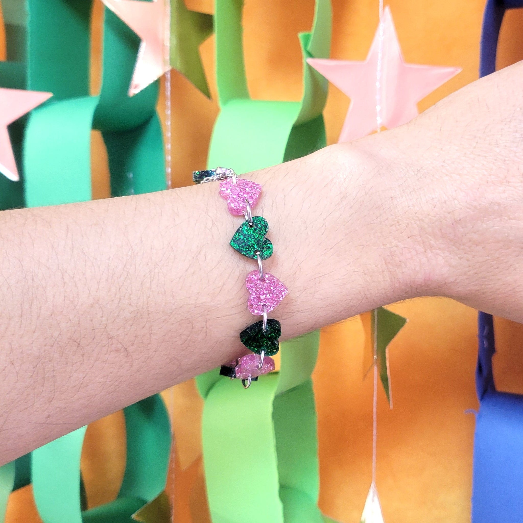 Celebrate unexpected friendships with the "Witch to be Understood" Pink and Green Heart Bracelet. Featuring alternating glittering hearts in vibrant pink and green, this statement piece shines with playful charm. It's the perfect accessory to showcase your journey of self-discovery and the magic of meaningful connections.