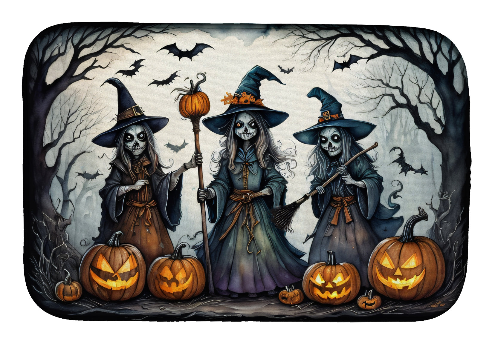 Celebrate Halloween with this Halloween Dish Drying Mat. Say goodbye to messy countertops and soggy dish towels with our innovative dish drying mat. Our high-quality dish drying pad is designed to keep your countertops dry while offering a stylish and efficient solution. Whether you're air drying dishes, glasses, stemware, silverware, pots, pans, bottles, or even fruits and vegetables, our dish mat is the perfect choice. The 14 inches x 22 inches size fits most counters and dish drying racks, and the non-slip design ensures stability. Made with water-absorbent polyester and a polyurethane foam insert, our dish drying mat is not only functional but also durable. It's machine washable and printed in the USA for long-lasting use. The beautiful artwork adds flair to your kitchen decor, making it a perfect housewarming gift or present for any occasion. Upgrade your kitchen experience with our absorbent and versatile dish drying mat.