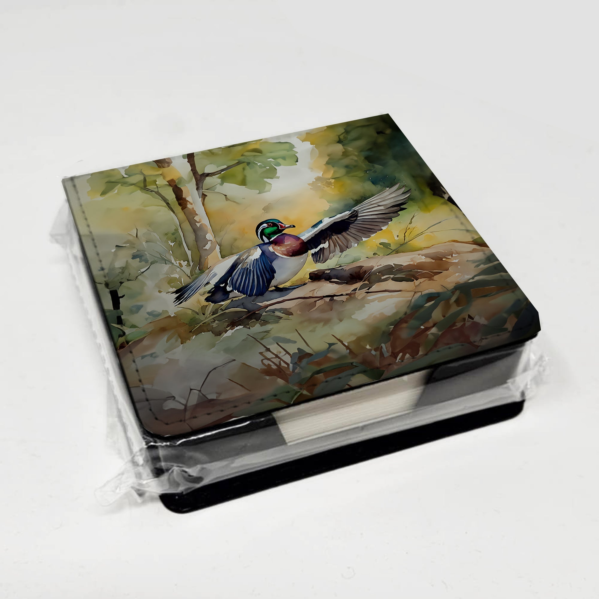 PU Leather Note Paper Holder featuring breed specific Wood Duck artwork. Elevate your workspace with this PU Leather Note Paper Holder, crafted to resemble luxurious leather without the use of animal products. Made from durable synthetic PU leather, it offers both a premium look and eco-friendly appeal. This note holder, compactly sized at 4.25 x 4.25 x 1.25 inches, includes about 160 sheets of 3.75 x 3.75-inch note paper—ideal for quick notes and reminders. An exclusive artist-designed cover makes each holder uniquely vibrant, adding a splash of color and personality to any desk or office. The discrete design keeps note paper hidden, maintaining a neat and organized workspace. Perfect as a gift or for personal use, this stylish holder is refillable with standard paper, ensuring long-lasting utility. A must-have for anyone seeking a sophisticated, artful touch to their workspace while supporting animal-friendly products. Add style, organization, and creativity to your everyday routine with this elegant note paper holder.